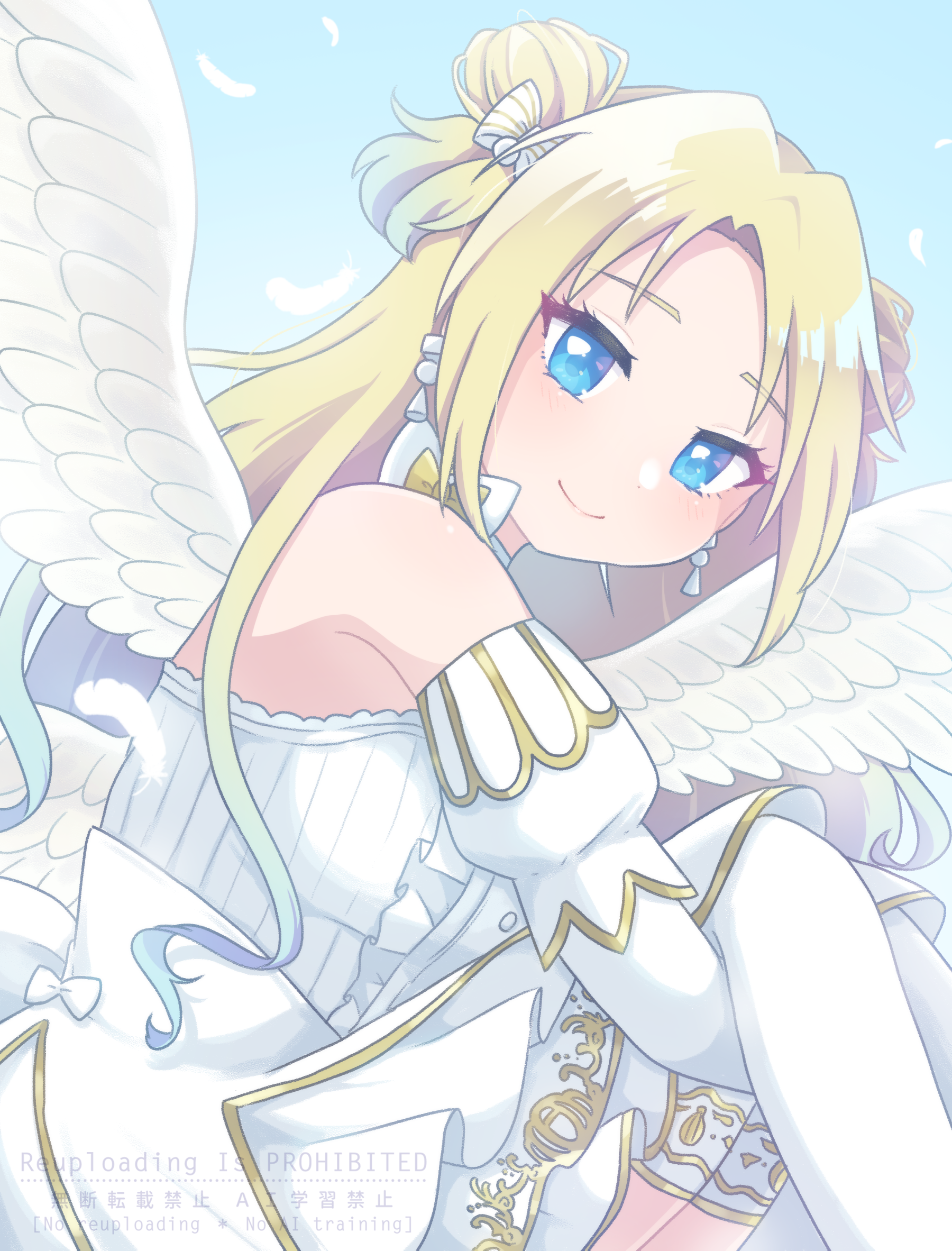 1girl angel_wings blonde_hair blue_eyes blue_hair blush bow closed_mouth commentary_request detached_sleeves double_bun dress earrings ether_aria_(love_live!) falling_feathers feathered_wings feathers feet_out_of_frame from_side gradient_hair hair_bow hair_bun highres jewelry juliet_sleeves light_blue_hair link!_like!_love_live! long_hair long_sleeves looking_at_viewer love_live! medium_dress miyaco_(shirataki_168) multicolored_hair multiple_wings official_alternate_costume osawa_rurino over-kneehighs parted_bangs puffy_sleeves smile solo split_mouth strapless strapless_dress thighhighs twintails virtual_youtuber watermark white_bow white_dress white_feathers white_thighhighs wings