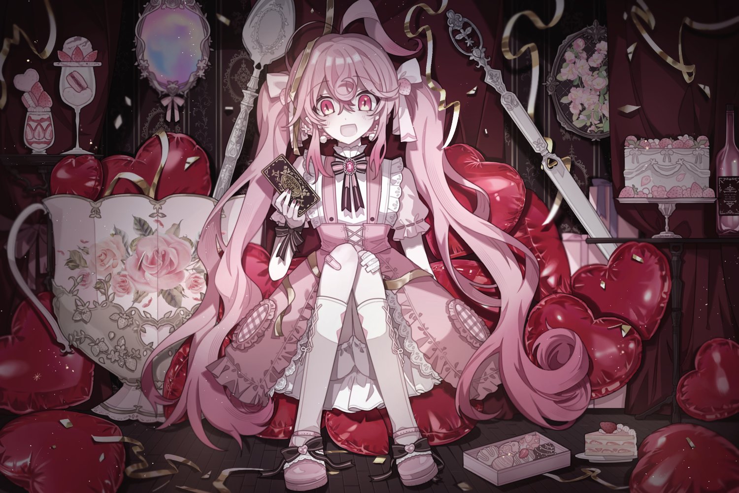 1girl ahoge balloon bow cake card cup dress elsword food hair_bow heart_balloon holding holding_card ino_(1hjzuy) knife laby_(elsword) long_hair multicolored_dress multiple_hair_bows open_mouth pink_dress pink_eyes pink_hair pink_shoes radiant_soul_(elsword) shoes smile socks solo spoon strawberry_cake teacup twintails white_bow white_dress white_socks