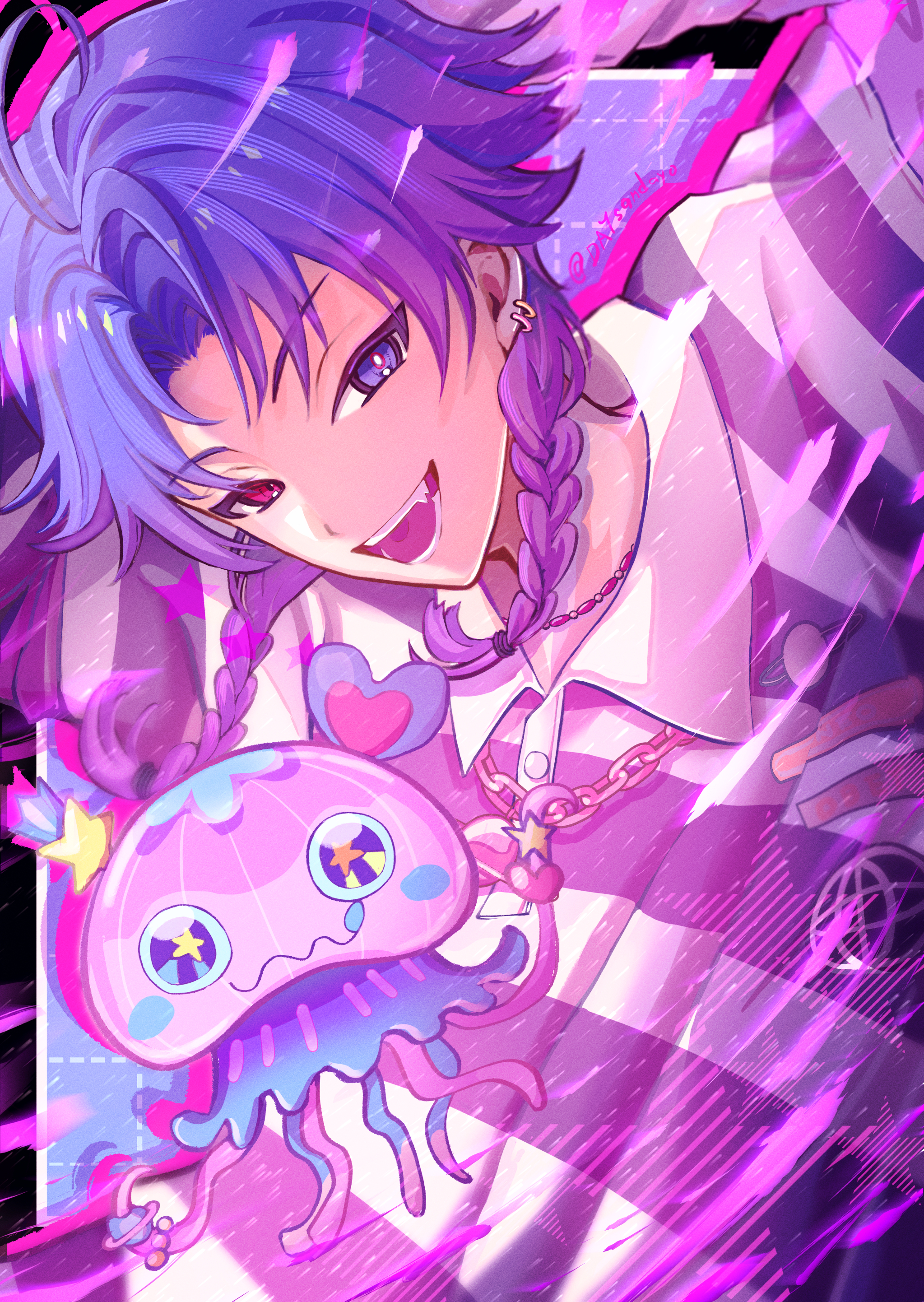 18trip 1boy absurdres bead_necklace beads braid chain chain_necklace daysandayo ear_piercing earrings fang gold_earrings heterochromia highres jellyfish jewelry long_sleeves looking_at_viewer male_focus necklace official_alternate_costume open_mouth piercing purple_hair smile striped_clothes twin_braids yowa_netaro