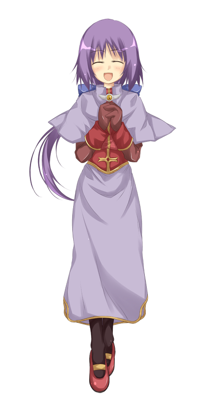 1girl :d acolyte_(ragnarok_online) black_socks blue_bow blush bow brown_gloves capelet closed_eyes full_body gloves hair_bow large_variant_set long_hair long_skirt long_sleeves low_ponytail mary_janes official_art open_mouth own_hands_together ponytail purple_capelet purple_hair purple_skirt ragnarok:_guild_masters ragnarok_online red_shirt red_shoes shirt shoes simple_background skirt smile socks solo standing transparent_background variant_set yumesato_makura