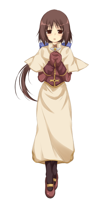 1girl :o acolyte_(ragnarok_online) black_socks blue_bow blush bow brown_eyes brown_gloves brown_hair brown_shirt capelet full_body gloves hair_bow half-closed_eyes large_variant_set long_hair long_skirt long_sleeves low_ponytail mary_janes official_art open_mouth own_hands_together ponytail ragnarok:_guild_masters ragnarok_online shirt shoes simple_background skirt socks solo standing transparent_background variant_set white_capelet white_skirt yumesato_makura
