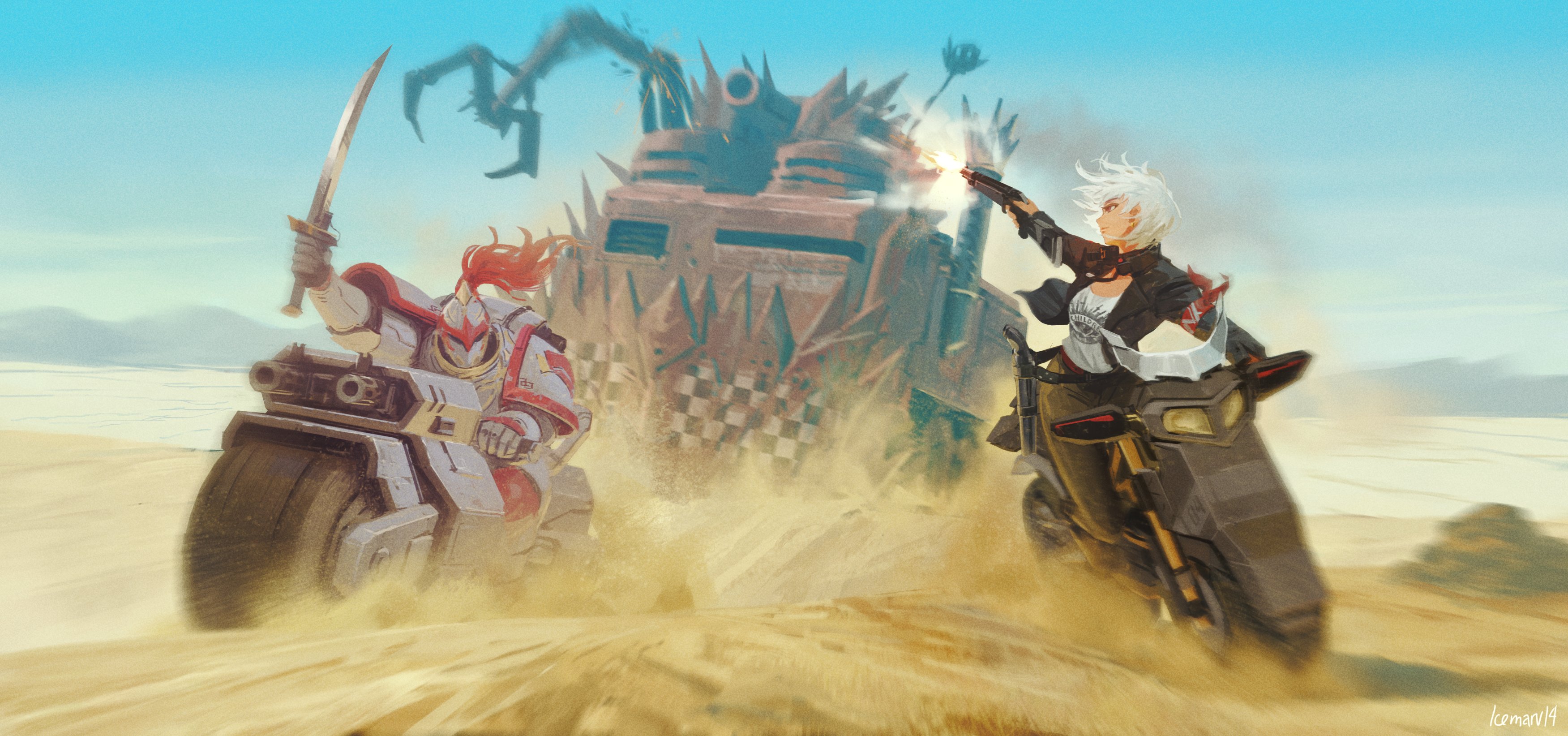 1boy 1girl absurdres adeptus_astartes armor black_jacket black_pants commentary crossover desert double-barreled_shotgun english_commentary firing full_armor full_body goddess_of_victory:_nikke gun helmet highres holding holding_gun holding_sword holding_weapon icemarv14 jacket long_sleeves motor_vehicle motorcycle mountainous_horizon orc ork_(warhammer) outdoors pants pauldrons red_eyes shirt short_hair shotgun shoulder_armor sugar_(nikke) sword warhammer_40k weapon white_hair white_scars white_shirt