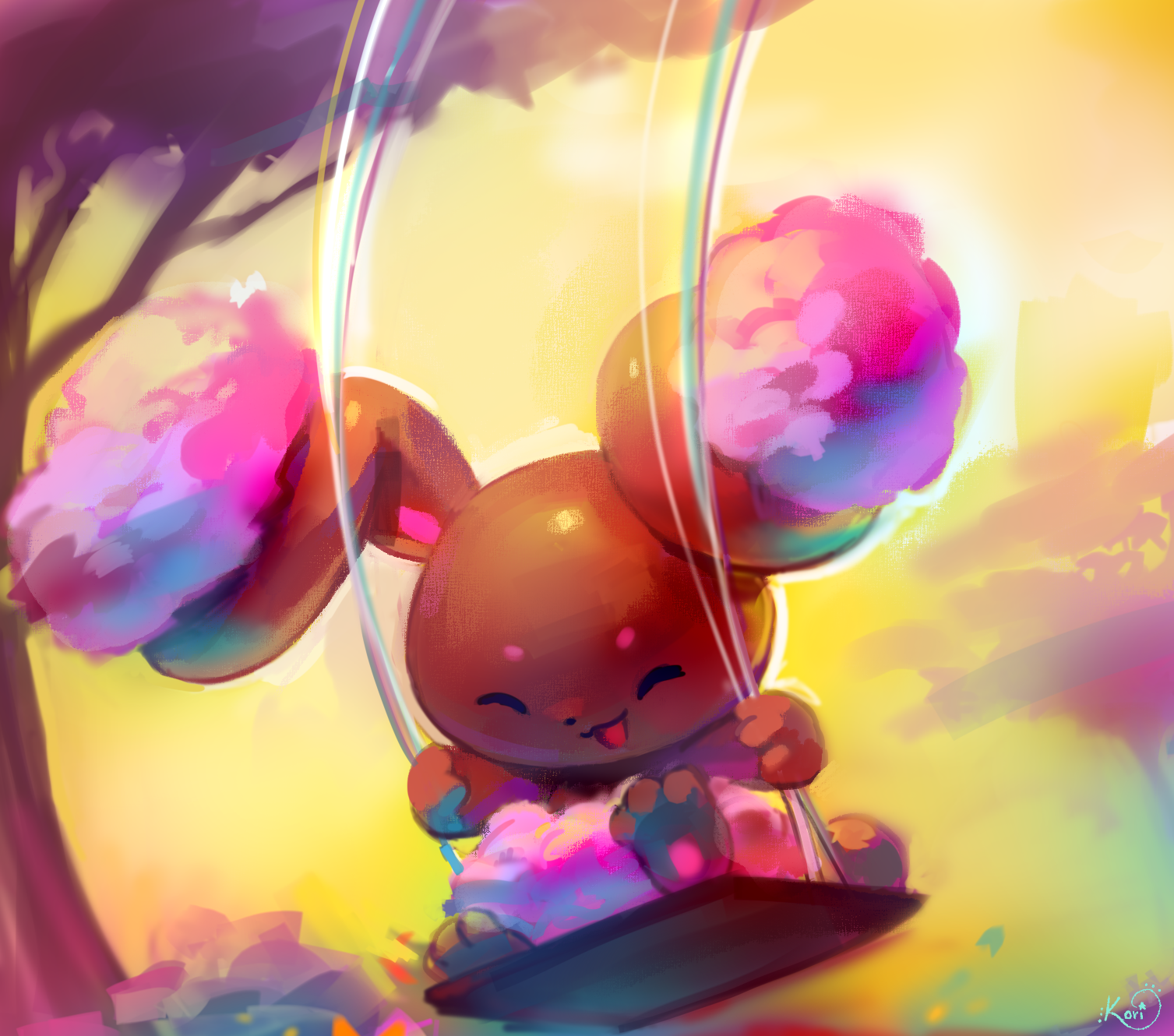 alternate_color animal_ears artist_name buneary closed_eyes commentary english_commentary forest gen_4_pokemon highres koriarredondo nature nintendo no_humans on_swing open_mouth pokemon pokemon_(creature) rabbit rabbit_ears shiny_pokemon signature swing swinging swinging_on_swing tongue tree