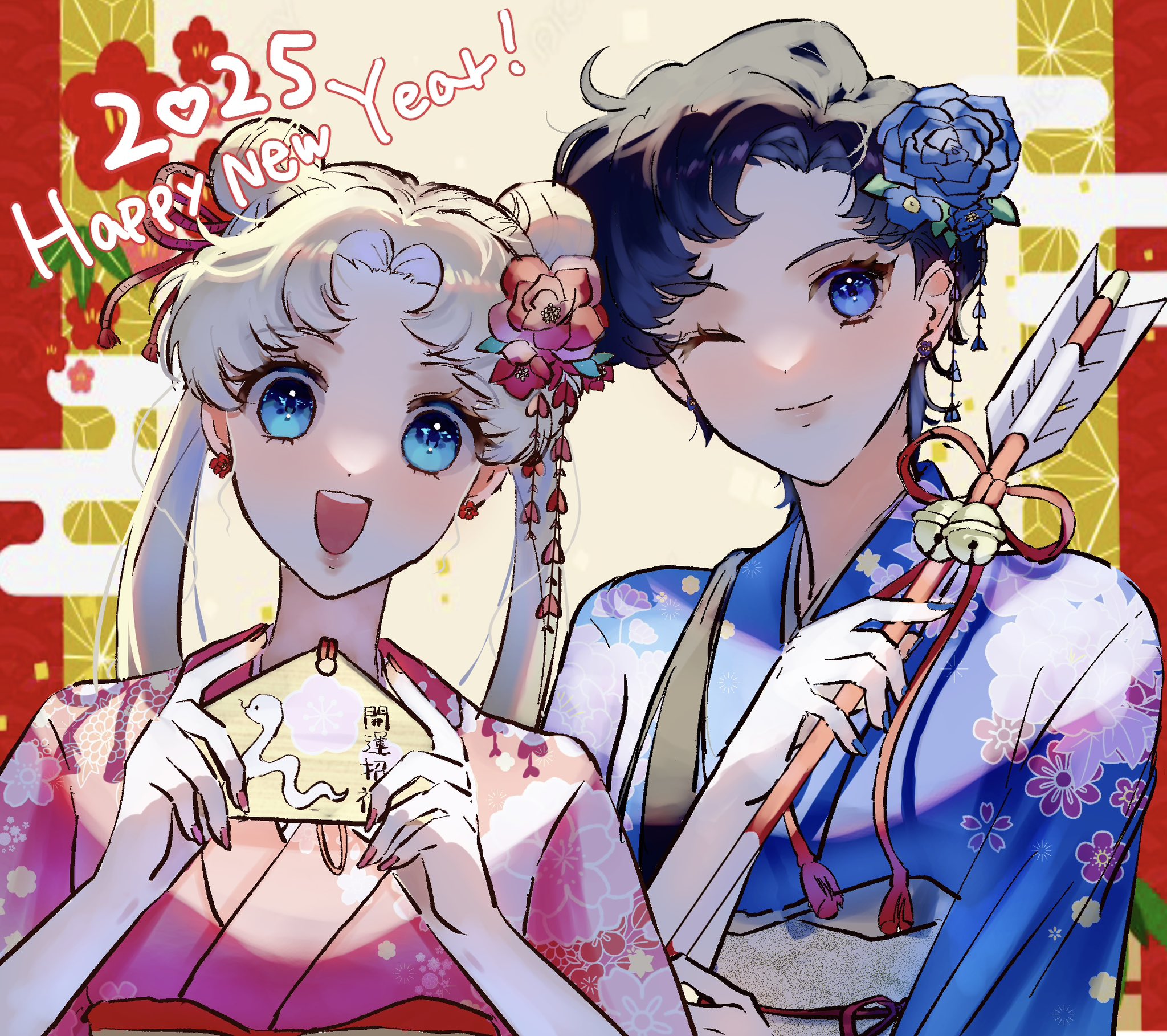 2025 arrow_(projectile) bishoujo_senshi_sailor_moon bishoujo_senshi_sailor_moon_stars black_hair blonde_hair blue_eyes blue_flower blue_kimono flower hamaya highres japanese_clothes kimono new_year pink_flower pink_kimono polish008800 seiya_kou tsukino_usagi