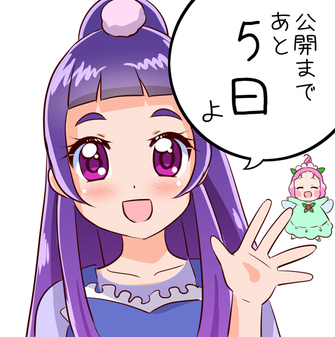 2girls blue_dress blue_shirt blush closed_eyes dress fairy ha-chan_(precure) izayoi_liko long_hair mahou_girls_precure! mitumi_mira multiple_girls one_side_up open_mouth pink_hair precure purple_eyes purple_hair shirt sleeveless sleeveless_dress smile white_background