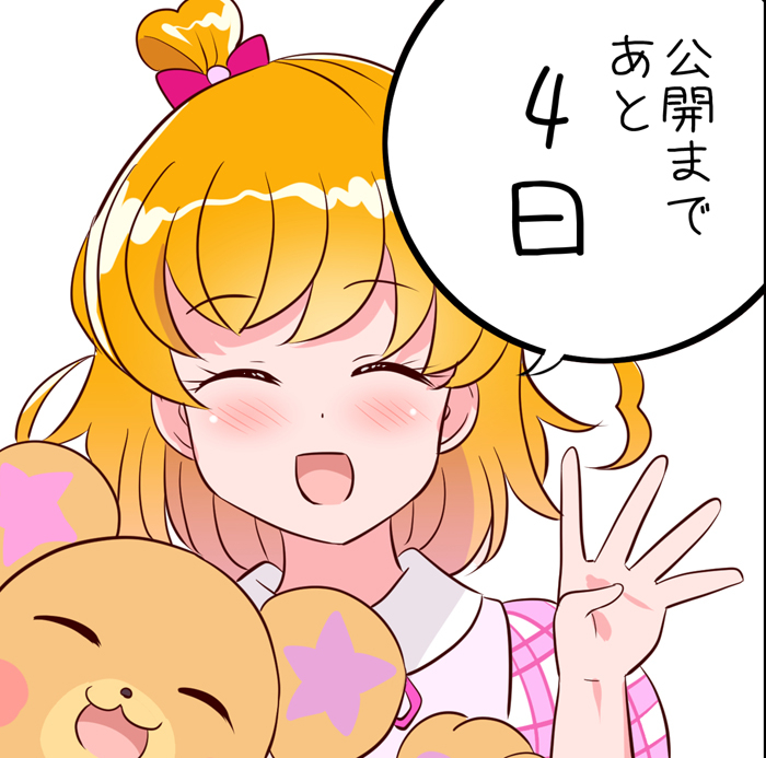 1girl asahina_mirai blonde_hair blush closed_eyes fairy mahou_girls_precure! medium_hair mitumi_mira mofurun_(precure) open_mouth pink_shirt precure puffy_short_sleeves puffy_sleeves shirt short_sleeves smile solo stuffed_animal stuffed_toy teddy_bear upper_body white_background