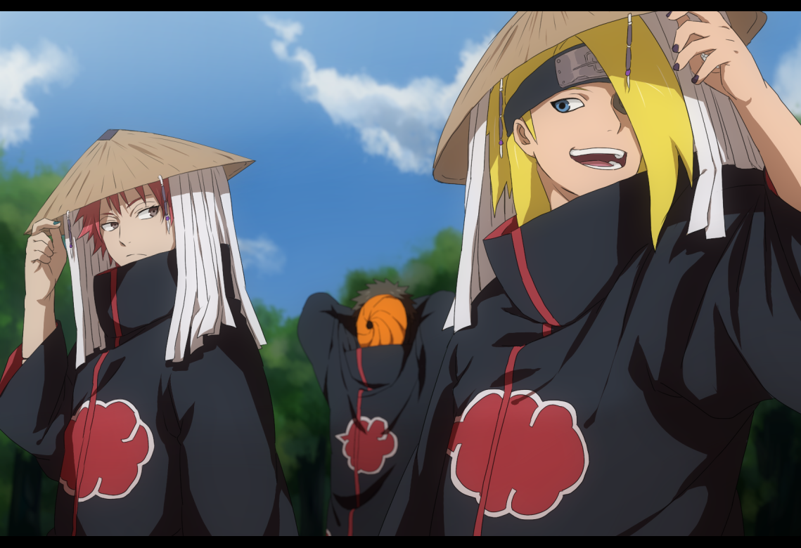 3boys akasuna_no_hedoro akatsuki_uniform black_hair black_nails blonde_hair blue_eyes brown_eyes closed_mouth cloud cloudy_sky commentary_request day deidara_(naruto) forehead_protector hair_over_one_eye hat high_collar iwagakure_symbol long_sleeves male_focus mask multiple_boys nail_polish naruto_(series) naruto_shippuuden ninja one_eye_covered open_mouth outdoors red_hair sasori_(naruto) short_hair sky smile teeth tobi_(naruto) uchiha_obito