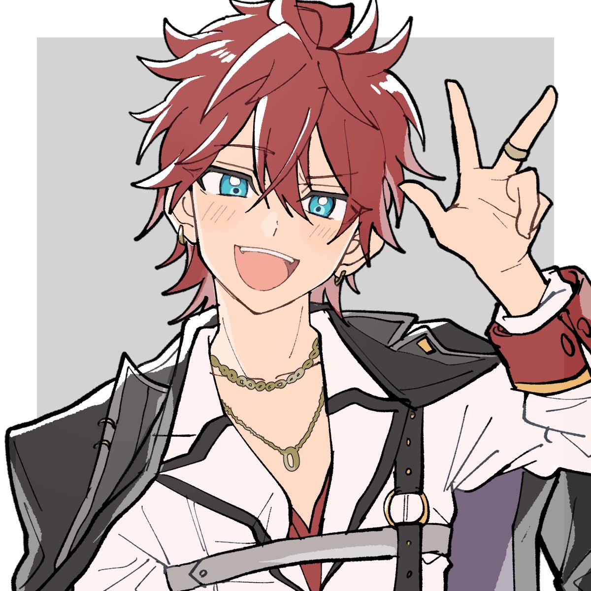 1boy amagi_rinne ariadne_(ensemble_stars!) blue_eyes border chain chain_necklace commentary earrings ensemble_stars! hand_up highres jacket jacket_over_shoulder jewelry long_sleeves looking_at_viewer male_focus necklace official_alternate_costume open_mouth outside_border red_hair ring ring_necklace solo techimi teeth unworn_jacket upper_body upper_teeth_only white_border