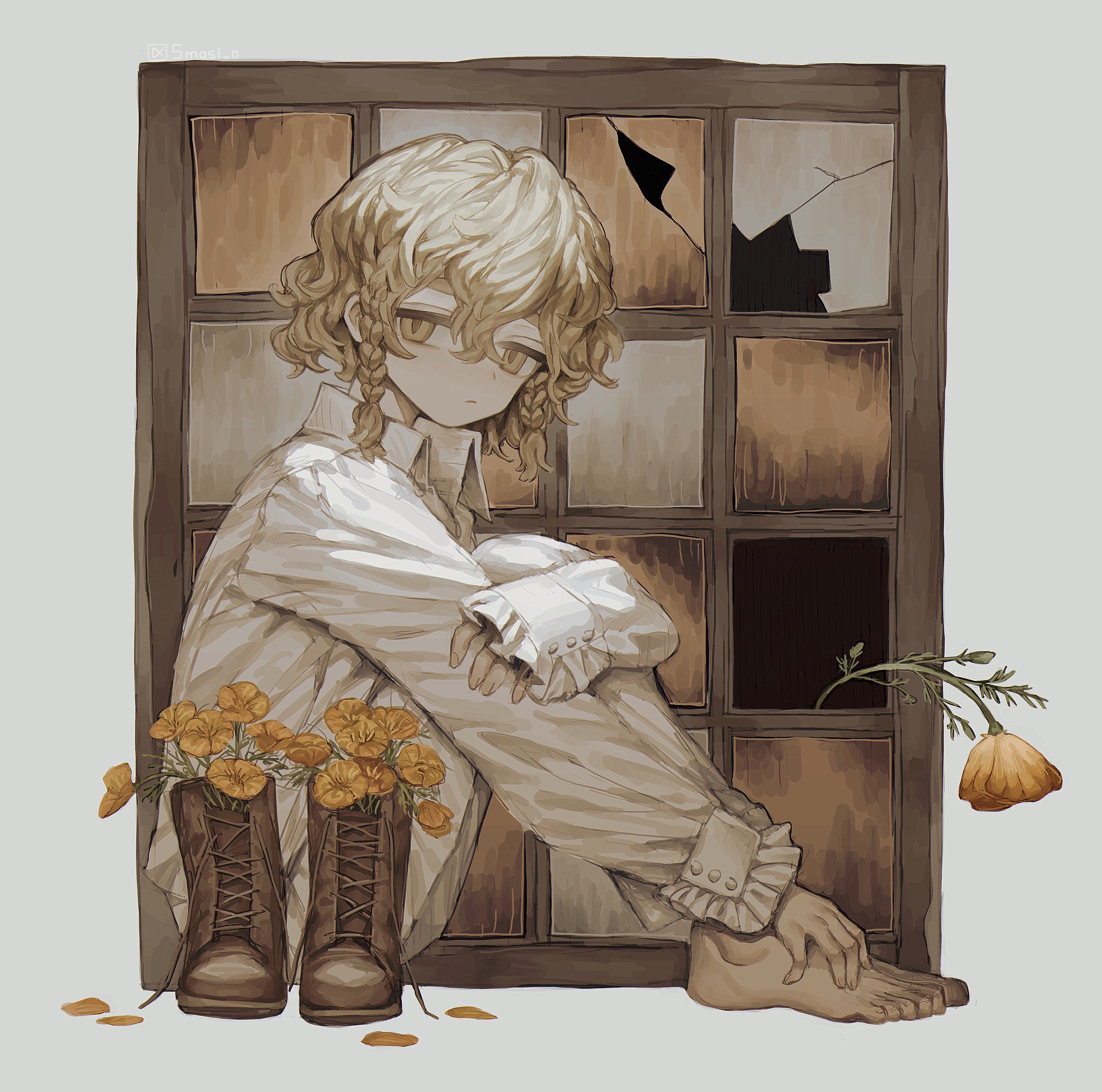 1boy 5masi_o absurdres artist_name barefoot blonde_hair boots braid braided_sidelock broken_window brown_boots brown_eyes brown_flower brown_theme character_request closed_mouth collared_shirt copyright_request expressionless feet fingernails flower full_body hair_between_eyes highres hugging_own_legs jitome long_sleeves looking_at_viewer looking_to_the_side pants shirt short_hair simple_background sitting sleeves_past_wrists solo turning_head unworn_boots white_background white_pants white_shirt