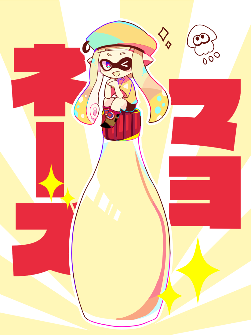 >_o 1girl beret blonde_hair blue_eyes blunt_bangs blush_stickers boots bright_pupils brown_boots brown_shorts chibi chibi_only colored_tongue commentary_request dot_nose full_body hat inkling inkling_girl inkling_player_character long_hair mayonnaise_bottle mini_person minigirl multicolored_eyes nintendo one_eye_closed open_mouth outline pink_eyes pointy_ears purple_eyes shirt short_sleeves shorts sitting sitting_on_object smile solo sparkle splatoon_(series) splatoon_2 t-shirt tentacle_hair translation_request twintails white_outline white_pupils whitedays yellow_hat yellow_shirt yellow_tongue