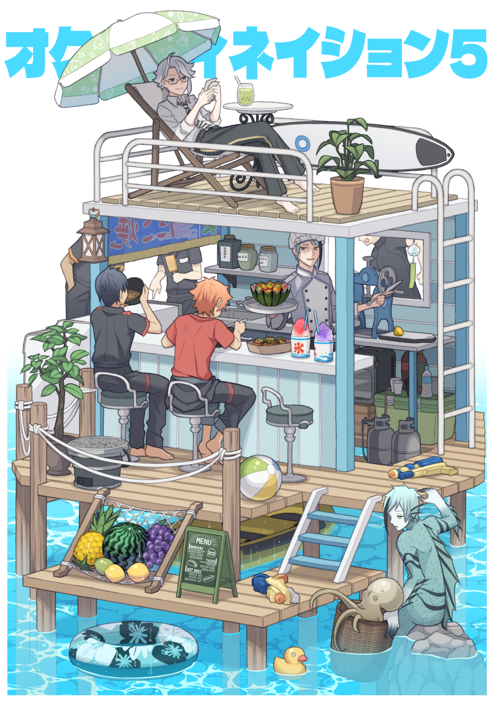 6+boys black_hair black_pants black_shirt blue_hair chair character_request closed_mouth collared_shirt eating floyd_leech floyd_leech_(eel) food fruit glasses grapes grey_eyes grey_hair grey_pants highres holding innertube itou_(mogura) lemon merfolk mermaid merman monster_boy monster_girl multiple_boys necktie octopus orange_hair pants parasol pineapple plant potted_plant red_shirt shaved_ice shirt sitting standing swim_ring twisted_wonderland umbrella water_gun watermelon white_shirt