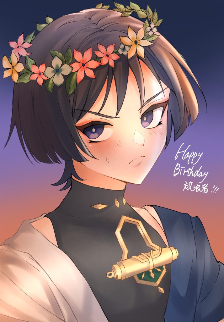 1boy alternate_headwear ankome_3 black_bodysuit black_hair blue_cape blunt_ends blush bodysuit bright_pupils cape character_name closed_mouth eyeliner eyeshadow flower flower_wreath genshin_impact gradient_sky happy_birthday japanese_clothes kimono looking_at_viewer makeup male_focus open_clothes open_kimono pink_flower portrait purple_eyes red_eyeliner red_eyeshadow red_flower scaramouche_(genshin_impact) shoulder_peek sky solo sweatdrop translation_request v-shaped_eyebrows wanderer_(genshin_impact) white_flower white_kimono white_pupils white_sleeves yellow_flower