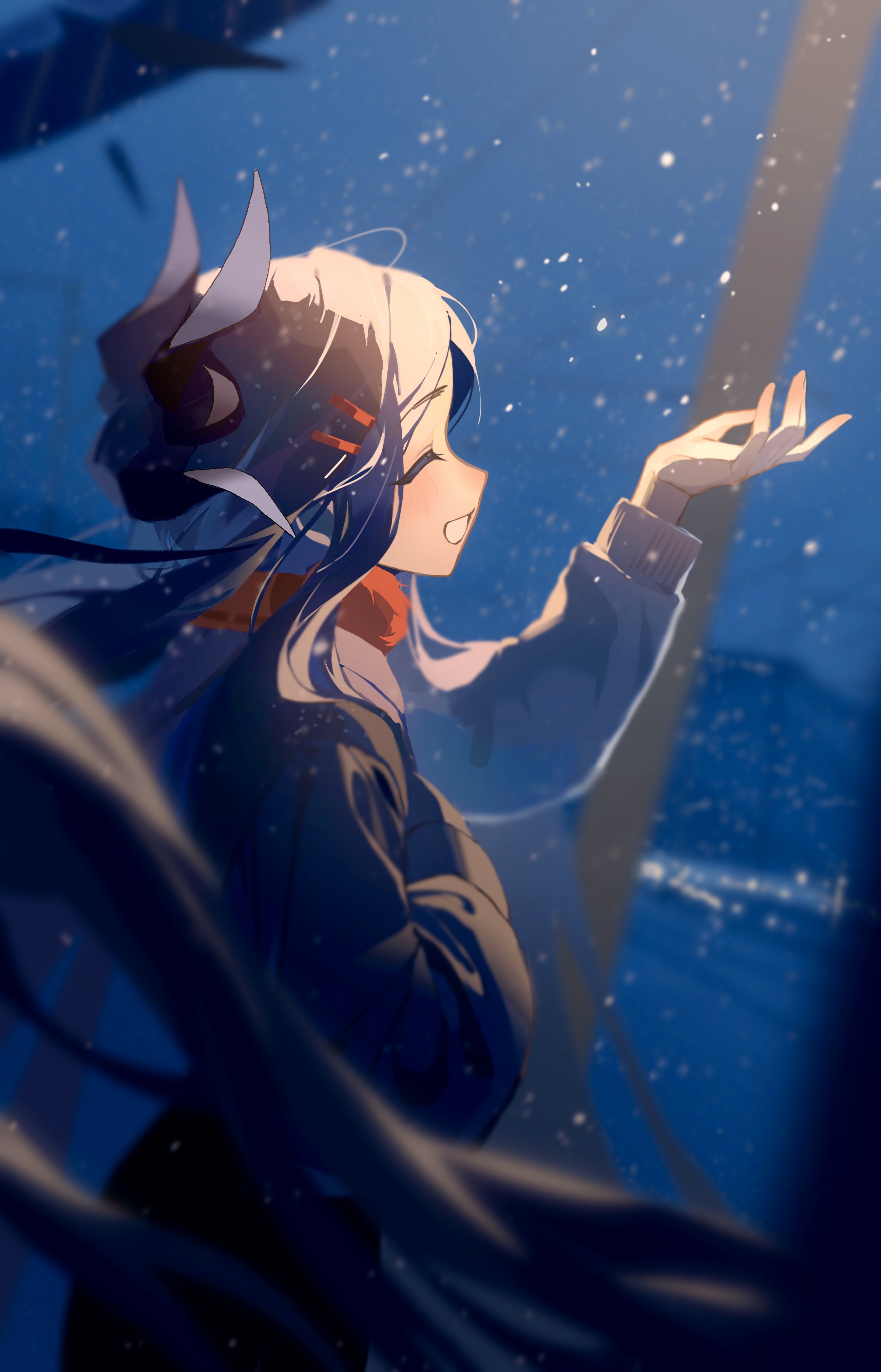 1girl ^_^ absurdres alternate_costume black_halo black_horns black_skirt blue_archive blurry closed_eyes commentary cowboy_shot demon_girl demon_horns depth_of_field floating_hair from_side grey_hair hair_ornament hairclip halo hand_up happy highres hina_(blue_archive) horns long_hair mohu_(shisenmohu) night outdoors profile red_scarf scarf skirt smile snowing solo sweater very_long_hair white_sweater winter winter_clothes