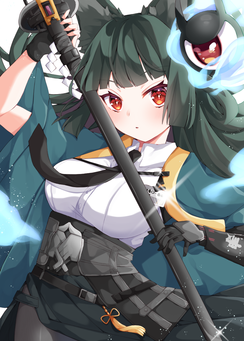 1girl animal_ear_fluff animal_ears arm_guards arm_up black_gloves black_necktie black_pantyhose black_skirt blue_fire breasts collared_shirt commentary_request dress_shirt fingerless_gloves fire gloves green_hair high-waist_skirt holding holding_sheath hoshimi_miyabi katana long_hair maki_soutoki medium_breasts necktie open_clothes pantyhose pleated_skirt red_eyes sheath sheathed shide shirt single_fingerless_glove skirt solo sword weapon white_shirt zenless_zone_zero