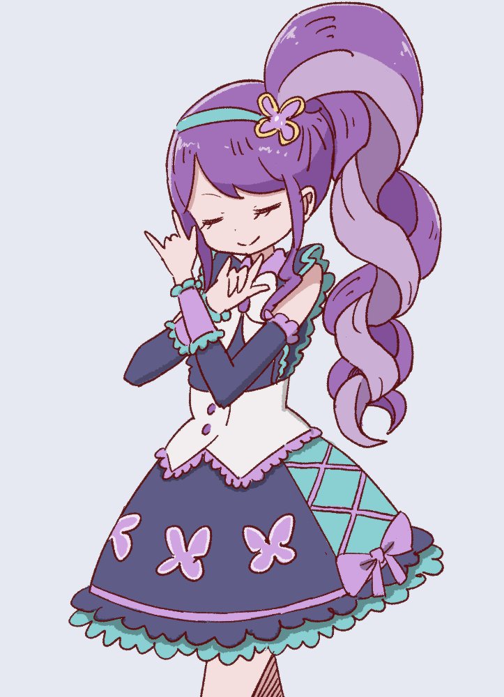 1girl blue_hairband bow closed_eyes closed_mouth commentary_request cowboy_shot crossed_arms detached_sleeves facing_viewer grey_background hairband hands_up idol_clothes junon_(pripara) long_hair long_sleeves multicolored_hair oosawa_(azeeee73) pretty_series pripara purple_bow purple_hair side_ponytail sidelocks simple_background smile solo standing streaked_hair