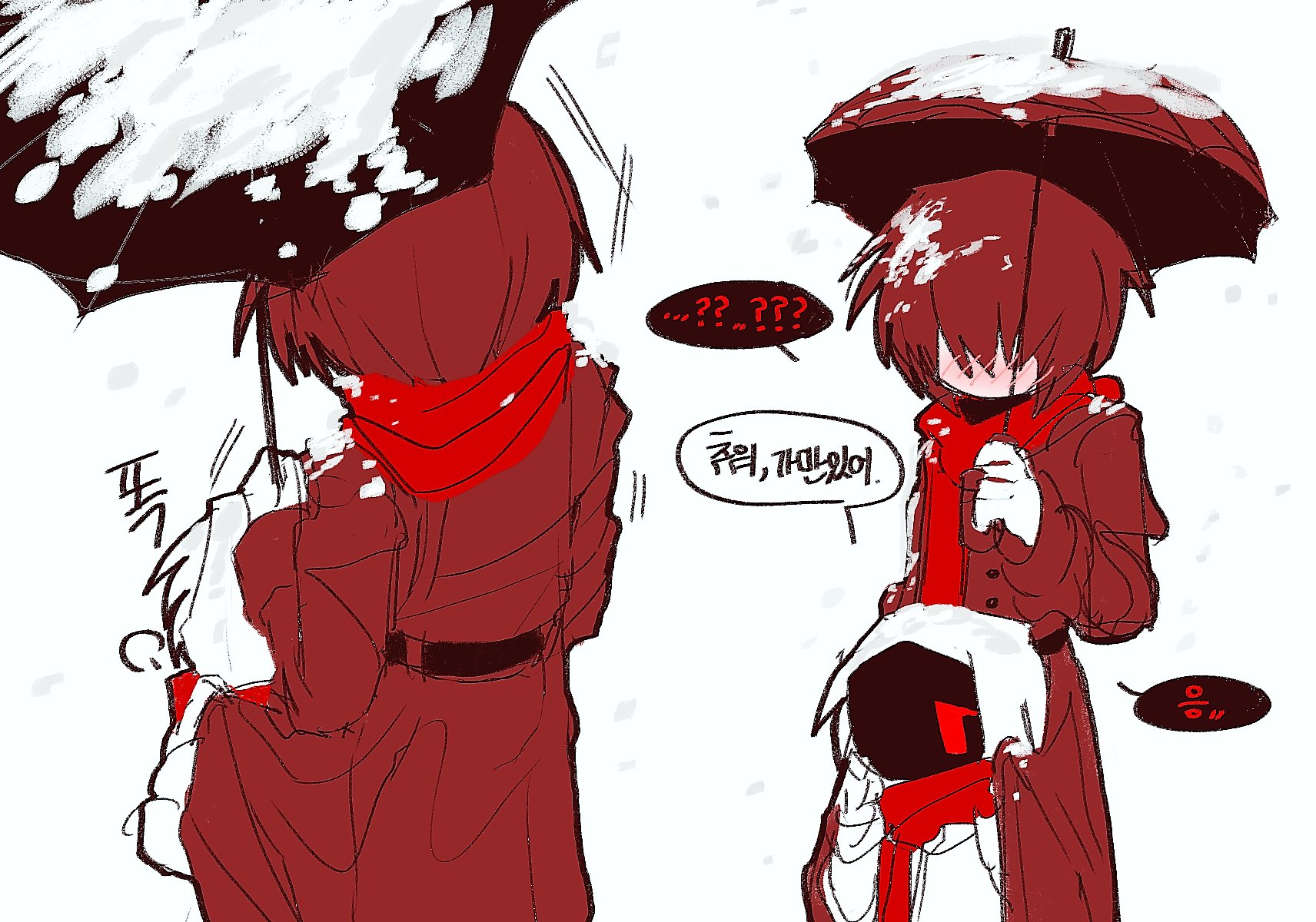 1boy 1girl blush coat commentary_request adashino_adami hetero highres holding holding_umbrella homicipher korean_commentary korean_text mr._scarletella raincoat red_coat red_eyes red_hair red_scarf red_umbrella scarf shared_clothes short_hair snowing t1669760880301 translation_request umbrella white_background white_raincoat