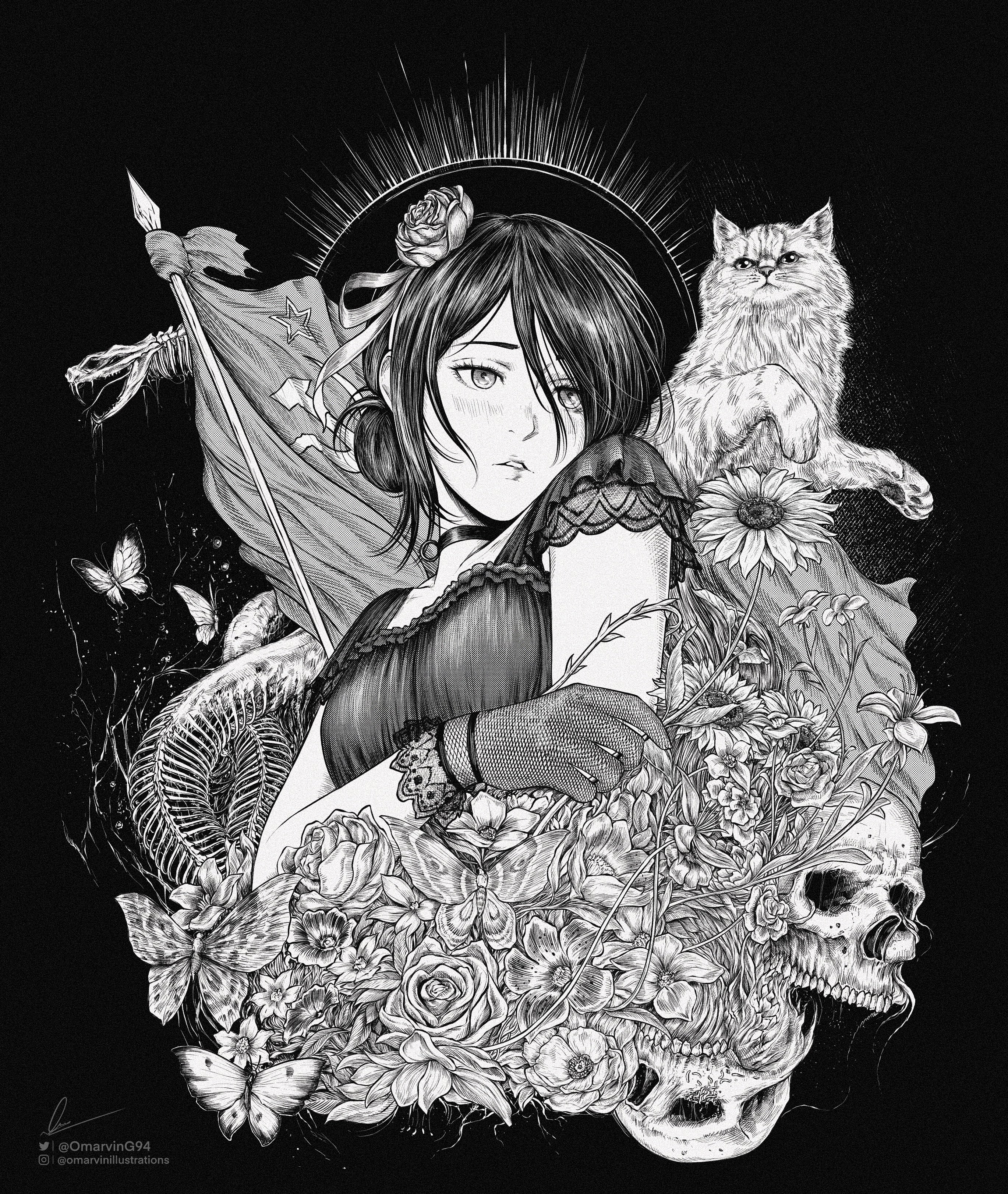 1girl absurdres animal animal_skeleton black_background black_choker black_dress black_gloves black_hair blush bone bug butterfly cat chainsaw_man choker commentary disintegration dress english_commentary flag flower gloves grey_eyes greyscale hair_bun hair_flower hair_ornament highres insect long_hair looking_to_the_side lotus marvin_(omarvin) monochrome reze_(chainsaw_man) rose skeleton skull solo soviet_flag spine sunflower