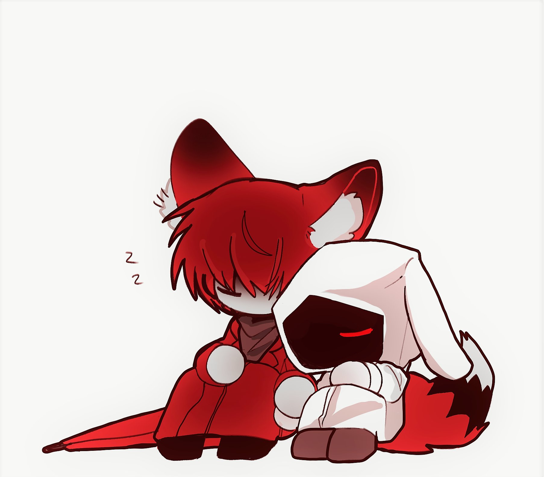 1boy 1girl animal_ears chibi closed_eyes coat commentary_request fox_boy fox_ears fox_tail full_body adashino_adami hetero highres holding_hands homicipher kemonomimi_mode korean_commentary mr._scarletella rabbit_ears rabbit_girl raincoat red_coat red_hair red_umbrella short_hair simple_background sitting t1669760880301 tail umbrella white_background white_raincoat