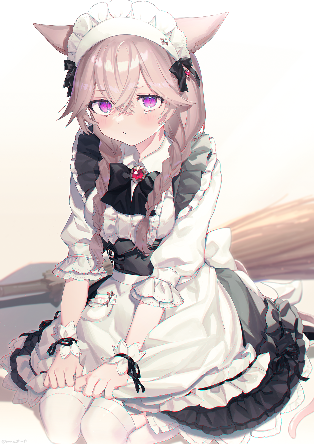 1girl alternate_costume animal_ears apron back_bow belt black_belt black_bow black_bowtie black_dress black_ribbon blush bow bowtie braid breasts broom cat_ears cat_girl cat_tail closed_mouth commentary_request crossed_bangs dress final_fantasy final_fantasy_xiv floor frills funa_(sakana) gem hair_between_eyes hair_ornament highres long_hair looking_at_viewer maid maid_headdress medium_breasts miqo'te original pink_eyes pink_hair puffy_short_sleeves puffy_sleeves red_gem ribbon seiza shadow short_sleeves simple_background sitting solo tail tears thighhighs twin_braids warrior_of_light_(ff14) white_apron white_background white_bow white_thighhighs wing_collar wrist_cuffs