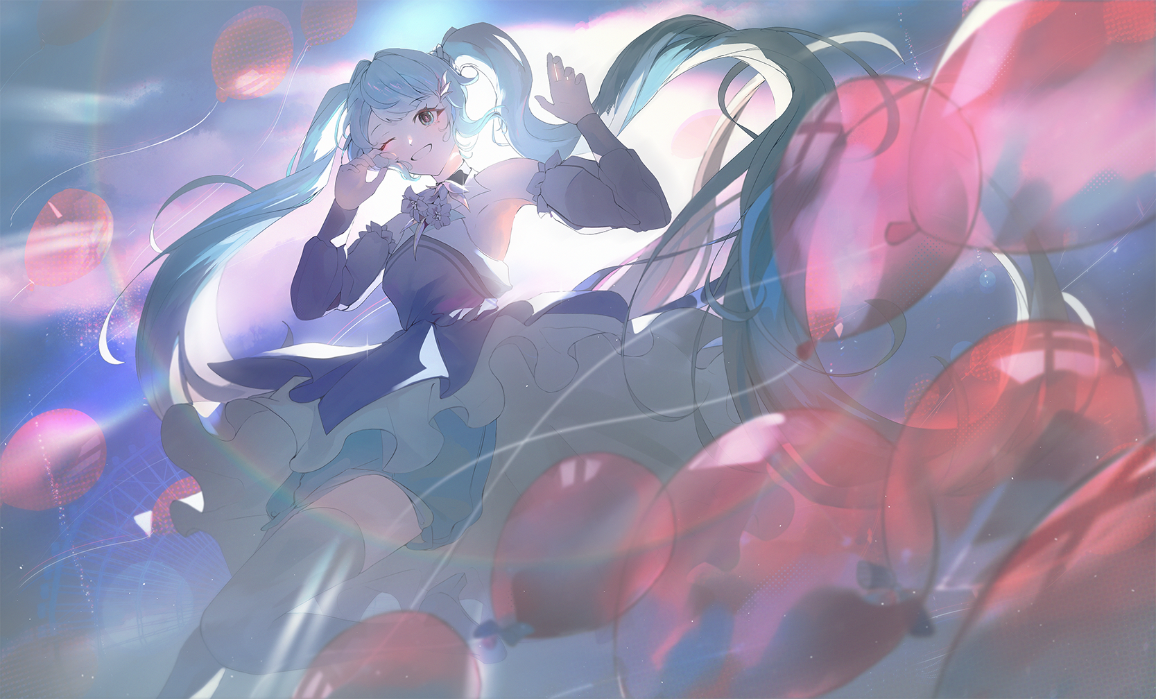 1girl armpits balloon bare_shoulders birthday bloomers boots commentary detached_sleeves dress english_commentary ferris_wheel frilled_dress frills grin hair_ornament hands_up hatsune_miku highres leg_up long_hair long_sleeves looking_at_viewer neck_flower one_eye_closed sidelocks sky sleeveless sleeveless_dress smile solo thigh_boots tiredghost twintails underwear very_long_hair vocaloid