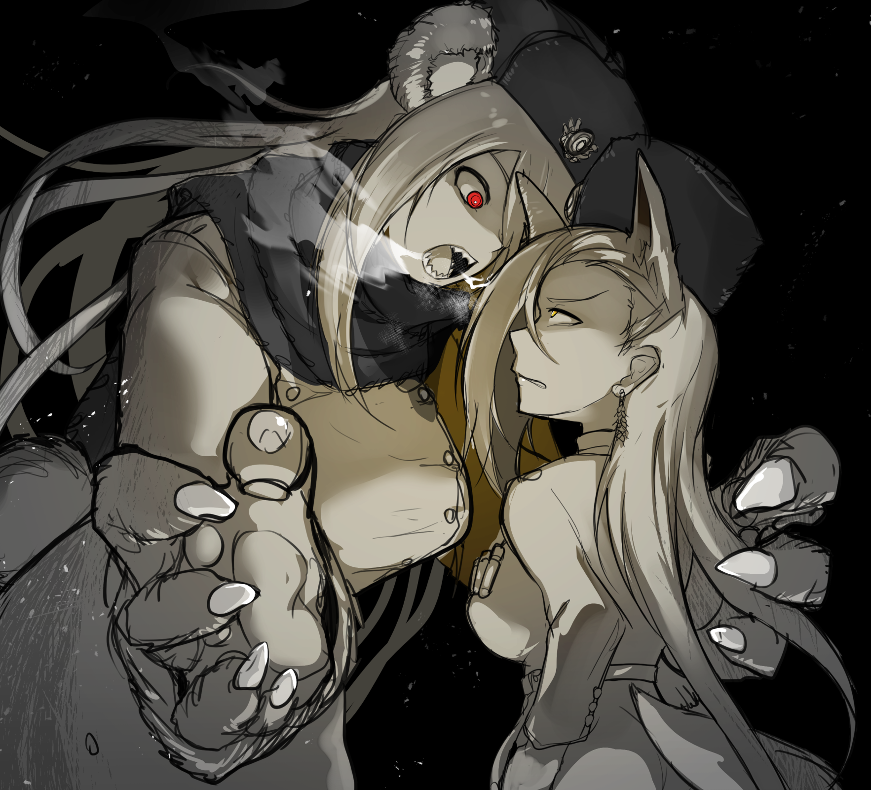 2girls animal_ears animal_hands bear_ears bear_girl bear_tail black_background black_hat black_scarf breasts breath buttons claws clothing_cutout commentary_request double-breasted earrings extra_ears hat highres jewelry large_breasts limited_palette long_hair looking_at_another military_uniform multiple_girls open_mouth original personification red_eyes russia russo-ukrainian_war ryuu_tou scarf shaded_face sharp_teeth tail tail_through_clothes teeth ukraine upper_body ushanka v-shaped_eyebrows wolf_ears wolf_girl wolf_tail yellow_eyes