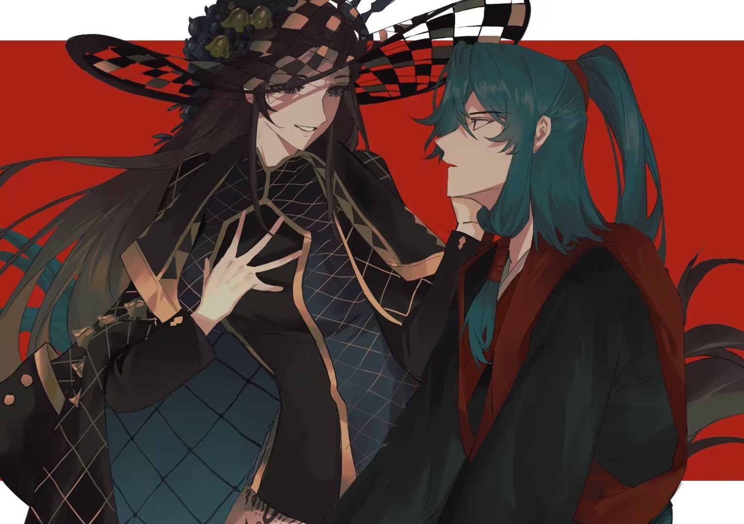 1boy 1girl black_dress black_hanfu brown_eyes brown_hair chinese_clothes dorothea_coyett dress fate/samurai_remnant fate_(series) green_hair hand_on_another's_face hanfu hat high_ponytail hollowed_headwear leg_tattoo long_hair long_sleeves looking_at_another low-tied_sidelocks open_mouth phanta ponytail red_background red_hanfu sidelocks simple_background smile tattoo wide_brim zheng_chenggong_(fate)