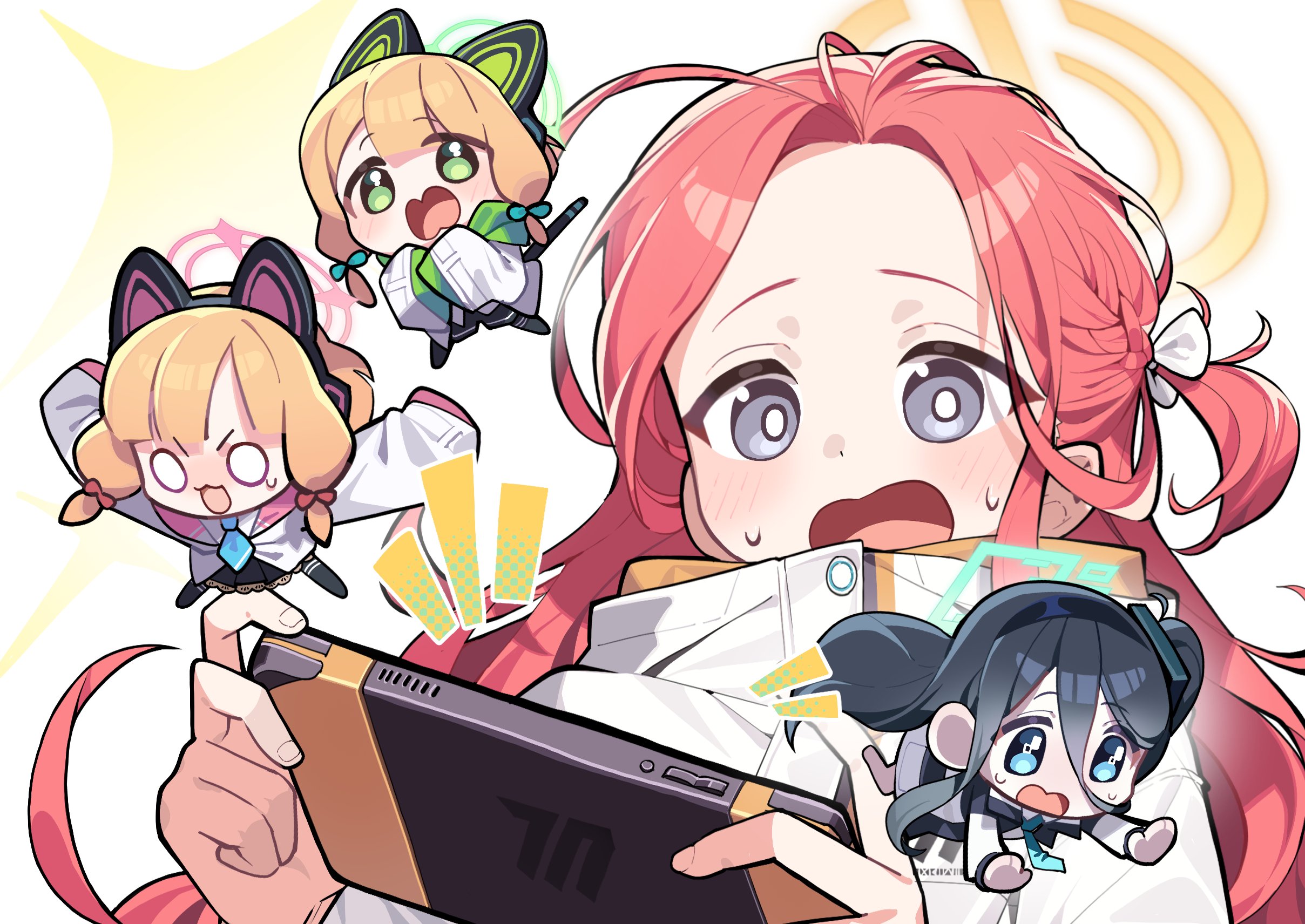 4girls :3 :o animal_ear_headphones animal_ears aqua_bow aqua_halo aqua_necktie aris_(blue_archive) black_hairband black_skirt black_thighhighs blonde_hair blue_archive blue_eyes bow cat_ears cat_tail chibi commentary_request confused fake_animal_ears falling forehead frilled_skirt frills gachop99 game_development_department_(blue_archive) green_eyes green_halo grey_eyes grey_hair hair_between_eyes hair_bow hairband halo handheld_game_console headphones highres holding holding_handheld_game_console jacket long_hair long_hair_between_eyes medium_hair messy_hair midori_(blue_archive) mini_person minigirl momoi_(blue_archive) multiple_girls necktie nintendo_switch notice_lines open_mouth outstretched_arms own_hands_together pink_halo ponytail red_hair scared short_ponytail siblings side_ponytail sidelocks simple_background sisters skirt sparkle sweat tail tail_raised thighhighs twins v-shaped_eyebrows very_long_hair white_background white_bow white_eyes white_jacket yellow_halo yuzu_(blue_archive)