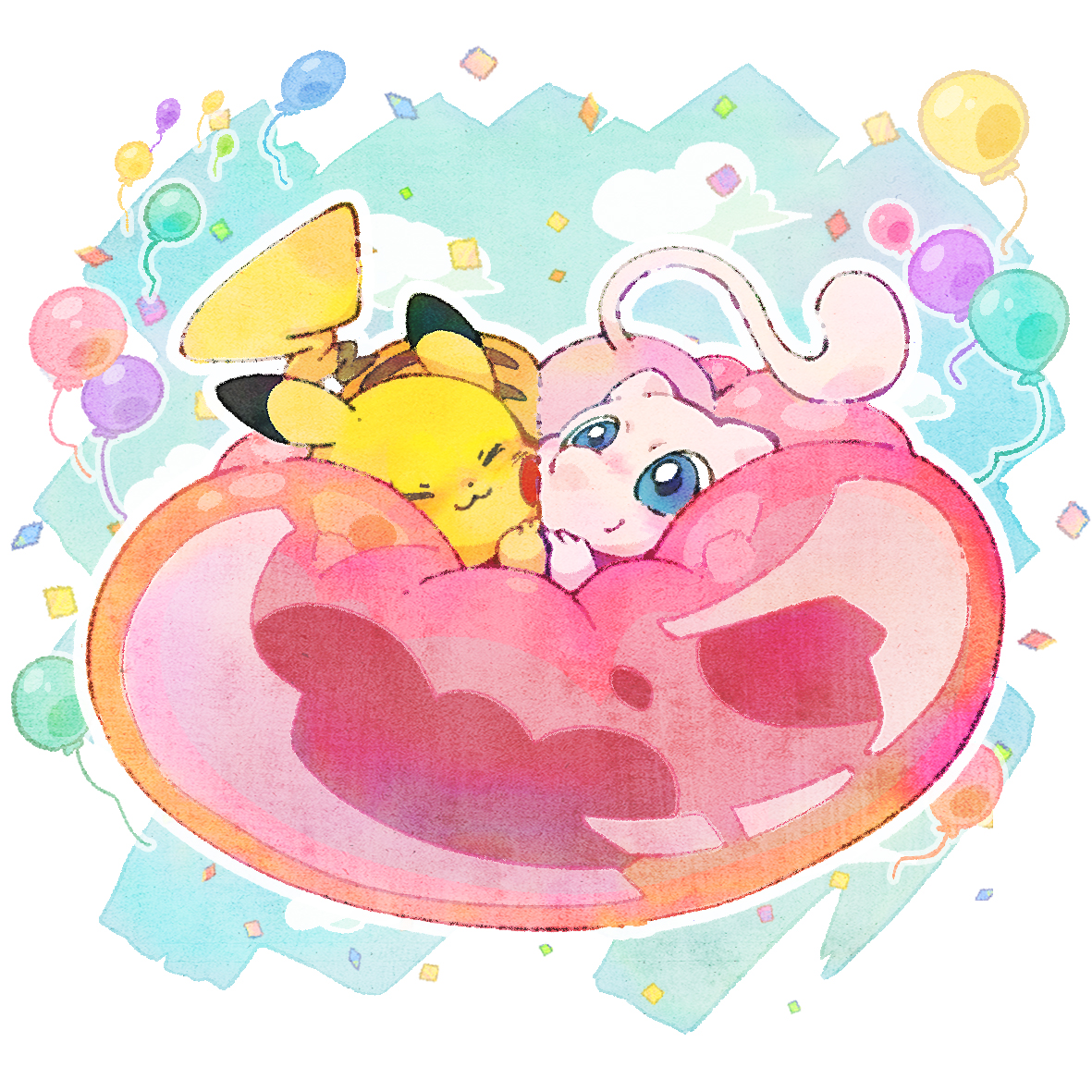:3 balloon border cheek-to-cheek closed_eyes closed_mouth commentary_request confetti cuddling full_body gen_1_pokemon heads_together imomushi_(pixiv_9001433) legendary_pokemon mew_(pokemon) mythical_pokemon nintendo no_humans pikachu pillow pokemon pokemon_(creature) smile white_border