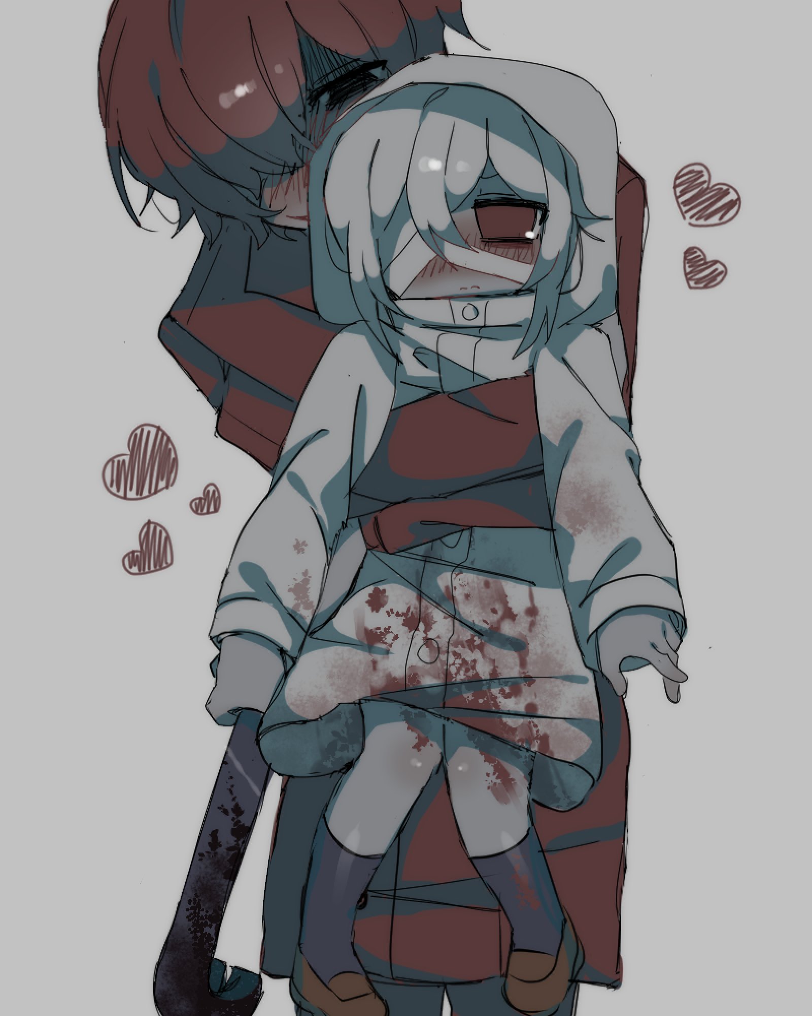 1boy 1girl blood blood_on_clothes bloody_weapon blush brown_coat brown_eyes brown_hair carrying carrying_person coat crowbar deliriumcenter grey_background grey_hair adashino_adami highres holding holding_crowbar homicipher hood hood_up loving_aura mr._scarletella muted_color raincoat short_hair simple_background weapon