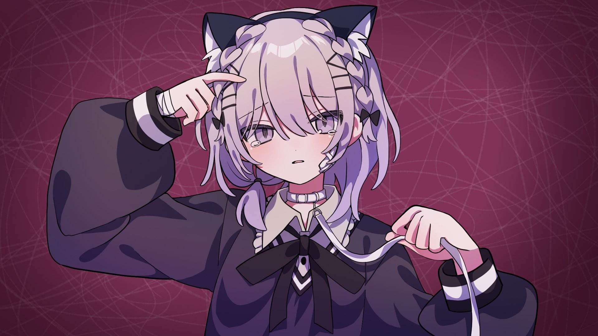 1girl animal_collar animal_ear_hairband animal_ears arm_up black_hairband black_ribbon braid cat_ear_hairband cat_ears cat_loving_(cevio) collar collared_shirt commentary_request fake_animal_ears grey_eyes grey_hair grey_sweater_vest hair_between_eyes hairband hand_on_own_head highres holding_own_leash indie_utaite looking_at_viewer medium_hair neck_ribbon parted_lips red_background ribbon sakigane_poshika sakigane_poshika_(artist) shirt solo sweater_vest tearing_up white_shirt wrist_wrap