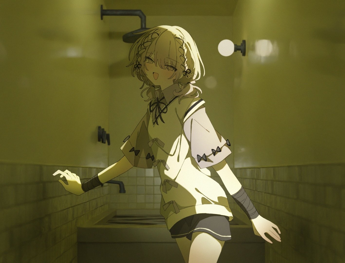 1girl :d bathroom black_bow black_shorts blush bow braid collared_shirt found_footage_(vocaloid) grey_eyes grey_hair grey_shirt indie_utaite light_bulb looking_at_viewer low_twintails open_mouth photo_background sakigane_poshika sakigane_poshika_(artist) shirt short_sleeves short_twintails shorts shower_head smile solo sweater_vest twintails white_sweater_vest wrist_wrap
