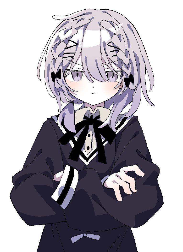 1girl black_bow black_ribbon black_sweater blush bow braid closed_mouth collared_shirt crossed_arms grey_eyes grey_hair hair_between_eyes hair_bow hair_ribbon indie_utaite light_blush long_sleeves looking_at_viewer neck_ribbon ribbon sakigane_poshika sakigane_poshika_(artist) shirt simple_background smile solo sweater white_background
