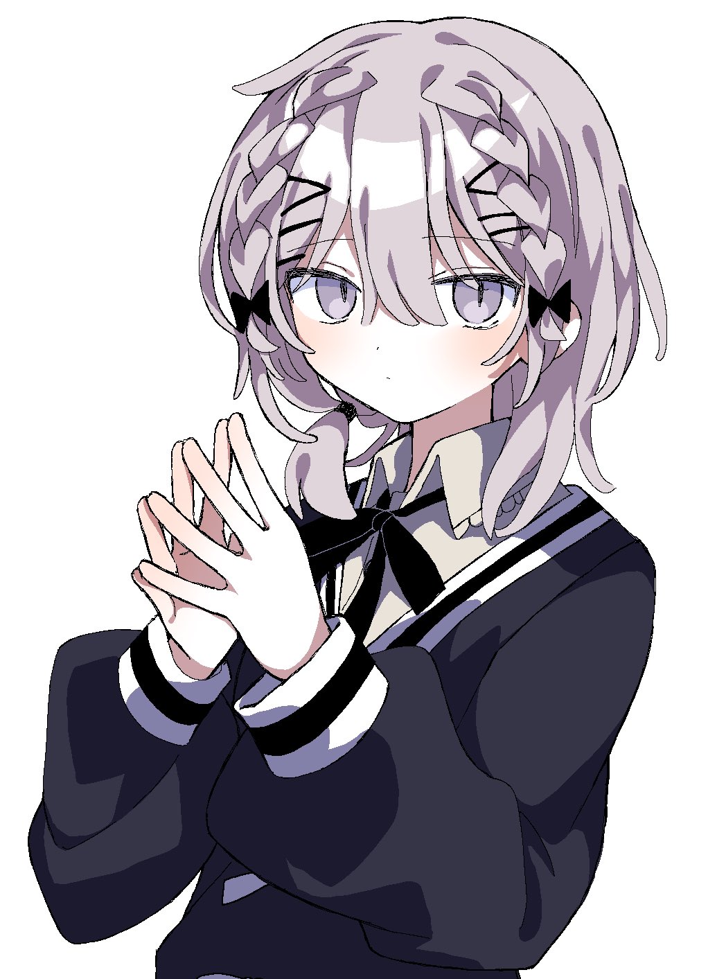 1girl black_bow black_ribbon black_sweater blush bow braid collared_shirt grey_eyes grey_hair hair_between_eyes hair_bow hair_ribbon hands_up highres indie_utaite neck_ribbon ribbon sakigane_poshika sakigane_poshika_(artist) shirt simple_background solo steepled_fingers sweater upper_body white_background white_shirt