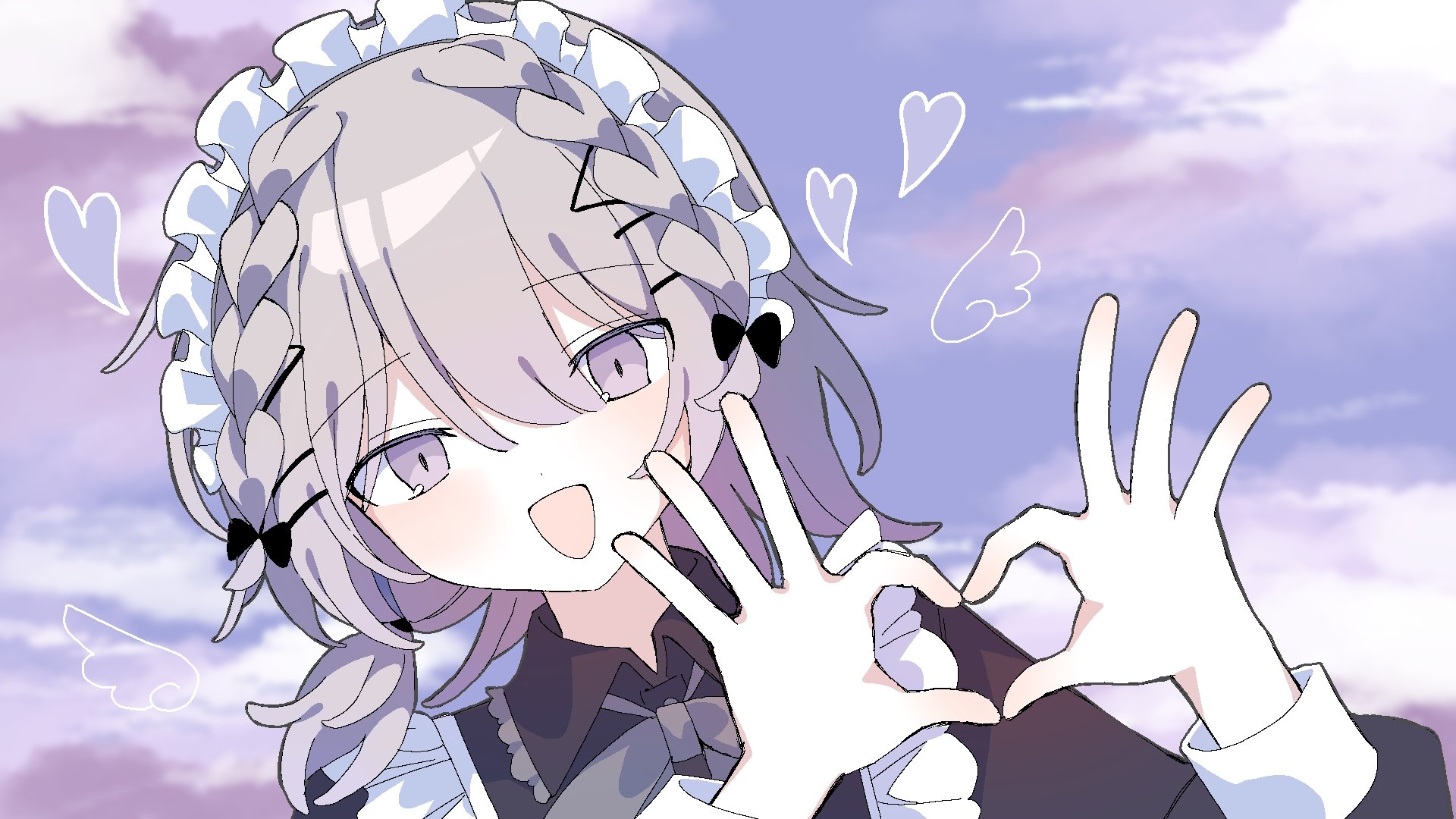 1girl four-finger_heart_hands :d black_bow black_dress black_ribbon blush bow braid cloud collared_dress dress grey_eyes grey_hair grey_ribbon hair_bow hair_ribbon hands_up heart heart_hands highres indie_utaite long_sleeves maid_headdress medium_hair neck_ribbon open_mouth ribbon sakigane_poshika sakigane_poshika_(artist) sky smile solo