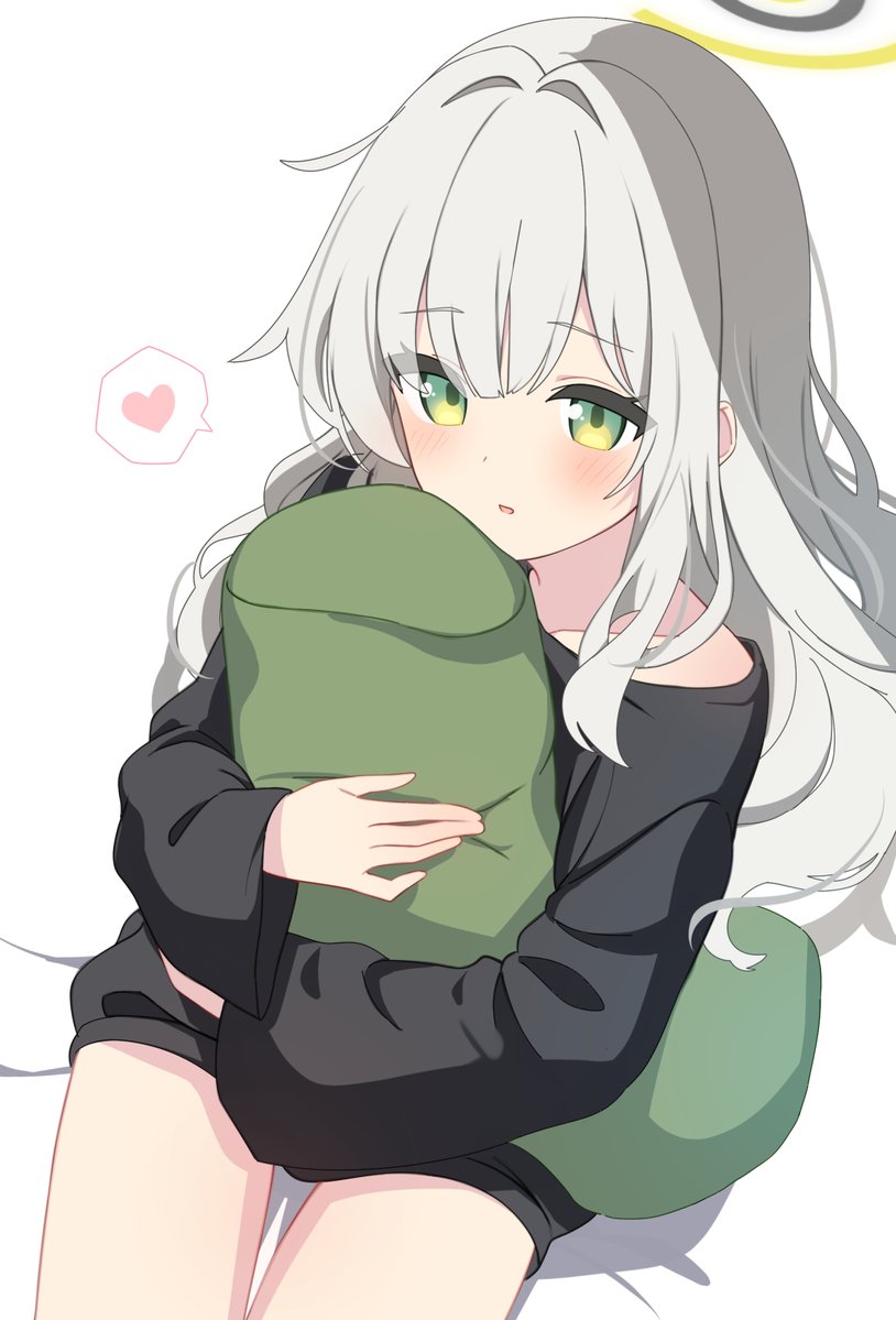1girl black_halo black_shirt blue_archive collarbone foulo_paints green_eyes hair_intakes halo hare_(blue_archive) heart hugging_object long_hair long_sleeves looking_ahead multicolored_halo parted_lips pillow pillow_hug shadow shirt simple_background single_bare_shoulder sitting solo spoken_heart two-tone_halo white_background white_hair wide_sleeves yellow_halo
