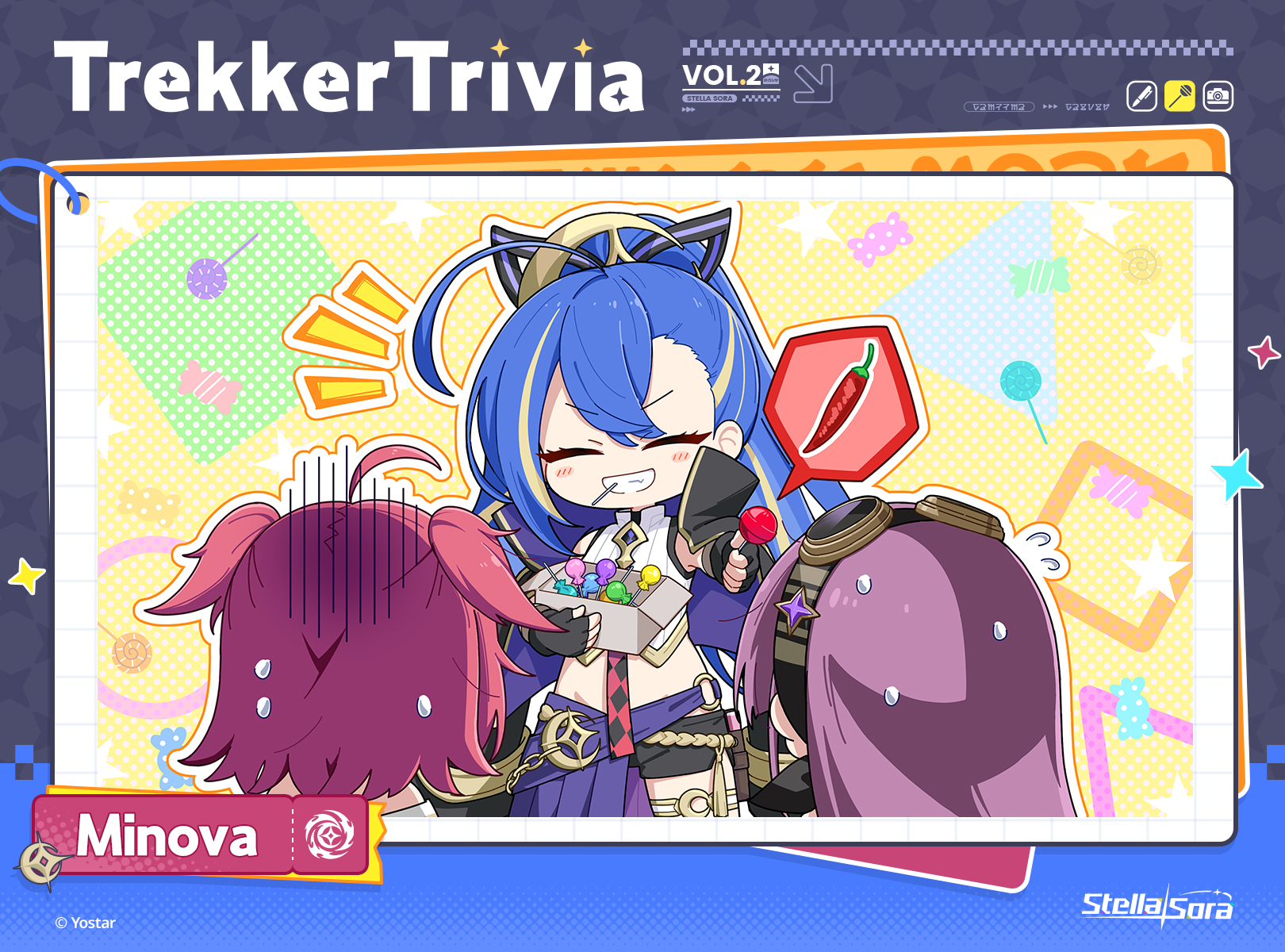 3girls ahoge black_shorts blonde_hair blue_hair box candy chili_pepper chupa_chups clueless collared_shirt commentary copyright_notice cropped_shirt deformed english_commentary english_text flying_sweatdrops food goggles goggles_on_head grin hair_between_eyes highres holding holding_box holding_candy holding_food holding_lollipop lollipop long_hair midriff minova_(stella_sora) mouth_hold multicolored_hair multiple_girls neuvira_(stella_sora) notice_lines official_art outline overskirt pleated_skirt ponytail purple_hair purple_skirt red_hair second-party_source shirt shiyoheee shorts skirt smile stella_sora streaked_hair sweat teeth_hold turn_pale two-tone_hair two_side_up v-shaped_eyebrows very_long_hair vollara_(stella_sora) white_outline white_shirt