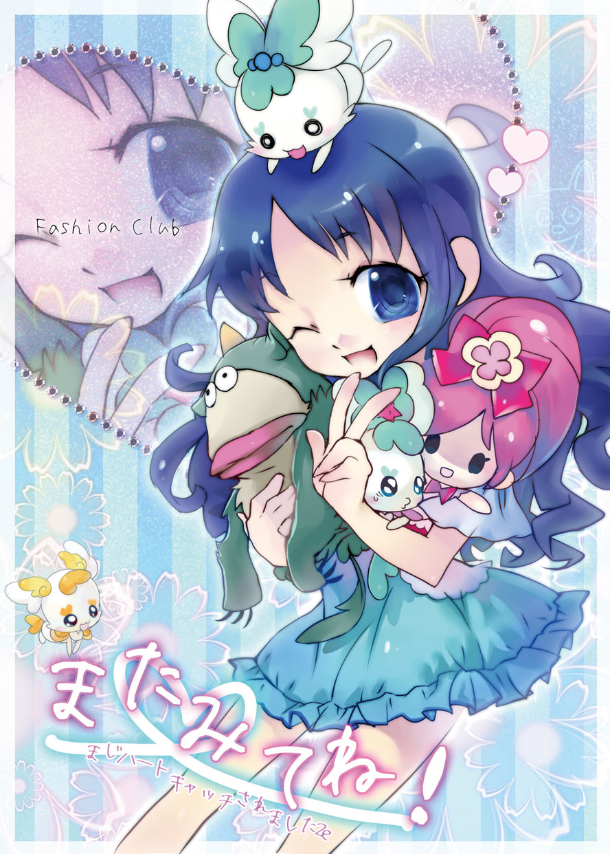 10s 1girl blue_eyes blue_hair bow character_doll chypre_(precure) coffret_(precure) coupe_(precure) creature cure_blossom doll dress female_focus hanasaki_tsubomi heart heartcatch_precure! high_ponytail highres kurumi_erika long_hair magical_girl matching_hair/eyes one_eye_closed pink_bow pink_hair ponytail potpourri_(precure) precure ribbon smile solo u_to_i v wink zoom_layer