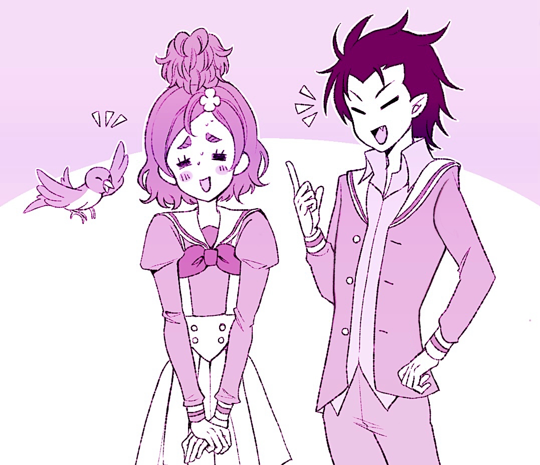 1boy 1girl bird blush close_(precure) closed_eyes demon_boy fang flower go!_princess_precure hair_bun hair_flower hair_ornament haruno_haruka jacket long_sleeves medium_hair monochrome neckerchief noble_academy_school_uniform open_clothes open_jacket open_mouth pants pointy_ears pre_greenblue precure sailor_collar school_uniform shirt short_hair single_hair_bun skirt suspender_skirt suspenders