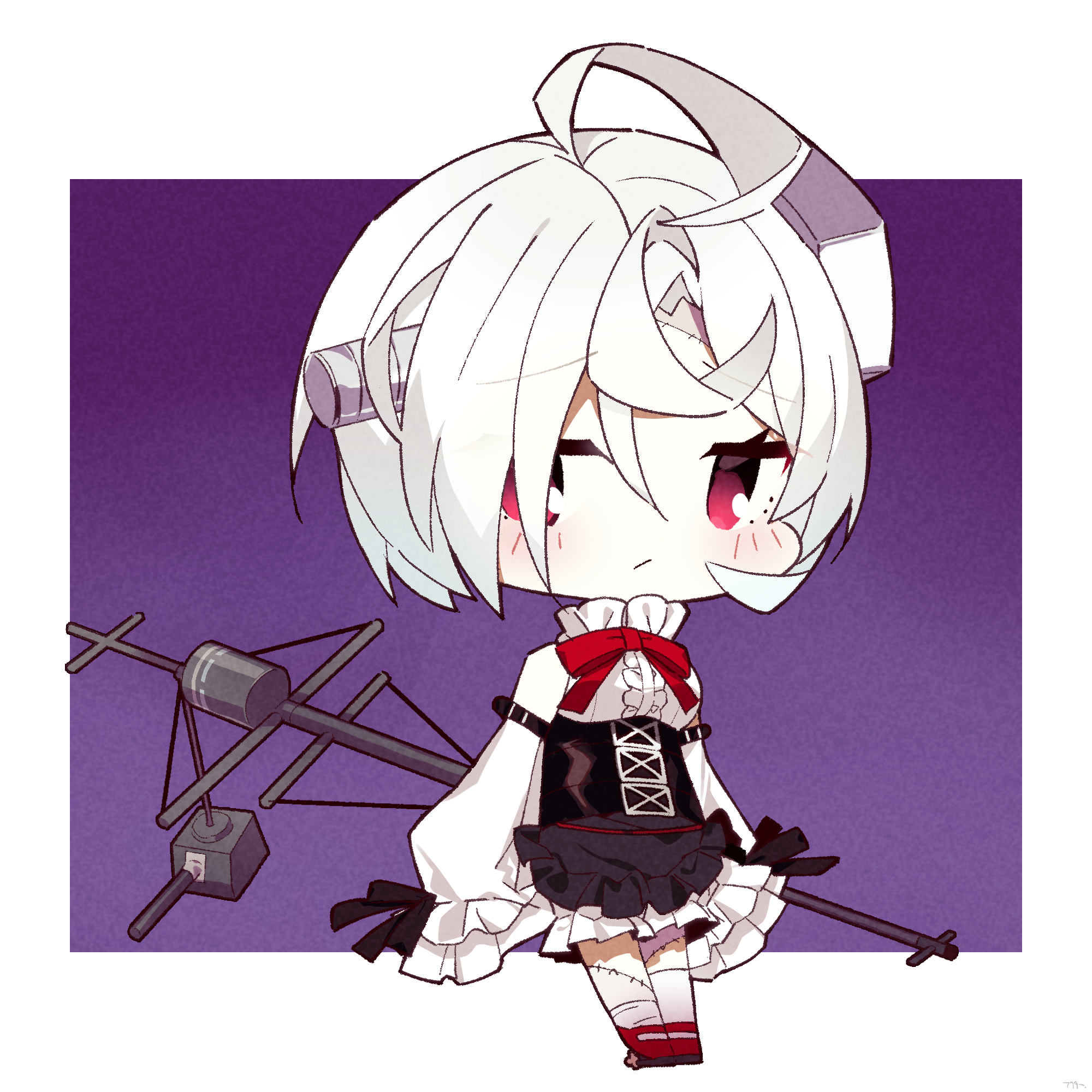 1girl akutaa azur_lane bow bowtie center_frills chibi chibi_only closed_mouth dress frilled_dress frills highres light_blush looking_at_viewer outline outside_border purple_background red_bow red_bowtie red_eyes short_hair simple_background sleeves_past_fingers sleeves_past_wrists solo terror_(azur_lane) white_hair white_outline