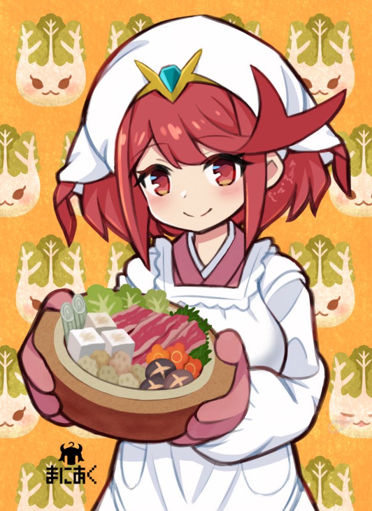 1girl alternate_costume food holding holding_food ma2acworks pyra_(xenoblade) red_eyes red_hair solo sukiyaki xenoblade_chronicles_(series) xenoblade_chronicles_2