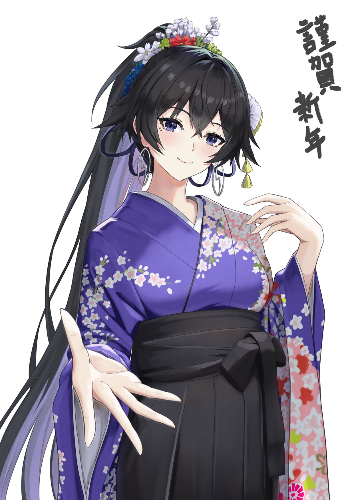 1girl black_hair black_hakama blue_eyes blue_hair blue_kimono bow colored_inner_hair commentary_request cowboy_shot double-parted_bangs earrings eyelashes floral_print floral_print_kimono flower furisode gurameso hair_between_eyes hair_flower hair_ornament hakama hakama_skirt happy_new_year head_tilt high_ponytail highres hoop_earrings japanese_clothes jewelry kamitsubaki_studio kanzashi kimono koko_(kamitsubaki_studio) light_blush long_hair long_sleeves looking_at_viewer mole mole_under_eye multicolored_hair new_year obi ponytail print_kimono reaching reaching_towards_viewer sash simple_background skirt smile solo standing translation_request tsumami_kanzashi virtual_youtuber waist_bow white_background