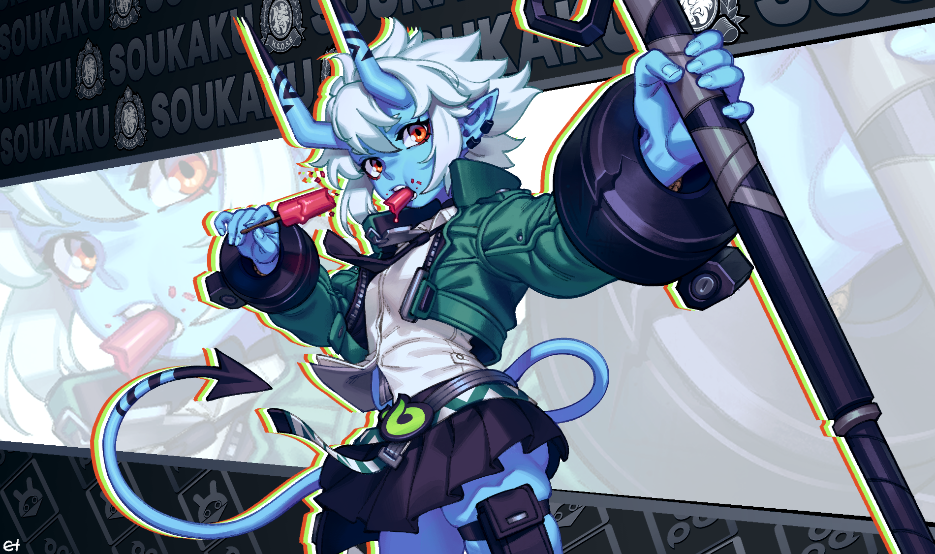 1girl black_horns black_necktie black_tail blue_horns blue_oni blue_skin blue_tail character_name colored_skin commentary cuffs demon_tail ear_piercing eigaka food food_in_mouth food_on_face green_jacket hair_between_eyes hair_between_horns highres holding holding_food holding_popsicle holding_weapon horns jacket jewelry multicolored_horns necktie oni piercing pointy_ears popsicle shirt short_eyebrows skin-covered_horns skindentation skirt soukaku_(zenless_zone_zero) tail thigh_strap two-tone_horns two-tone_tail weapon white_hair white_shirt zenless_zone_zero