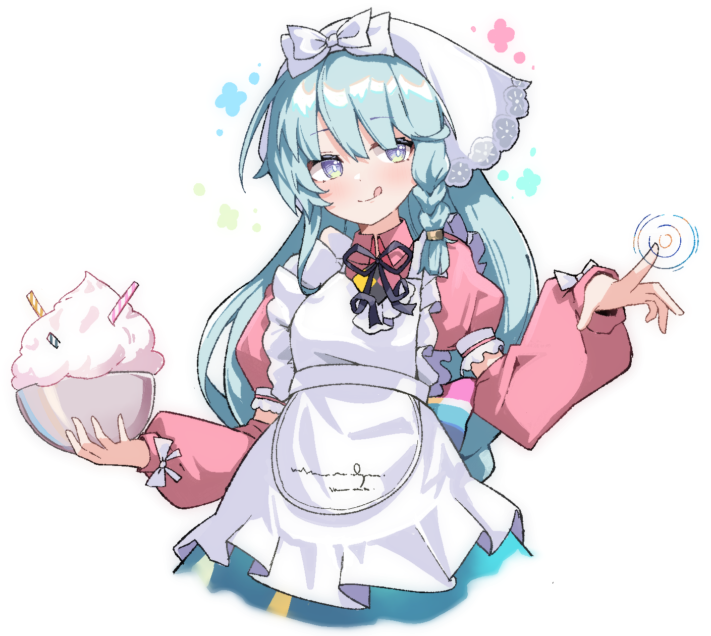 1girl aqua_eyes aqua_hair black_ribbon bowl braid collared_shirt commentary_request cropped_legs detached_sleeves highres holding holding_bowl hururu_(vldptmxk1054) licking_lips long_hair neck_ribbon pink_shirt puffy_short_sleeves puffy_sleeves ribbon shirt short_sleeves side_braid simple_background single_braid solo tongue tongue_out white_background xinyue_tongxing yuebai_(xinyue_tongxing)