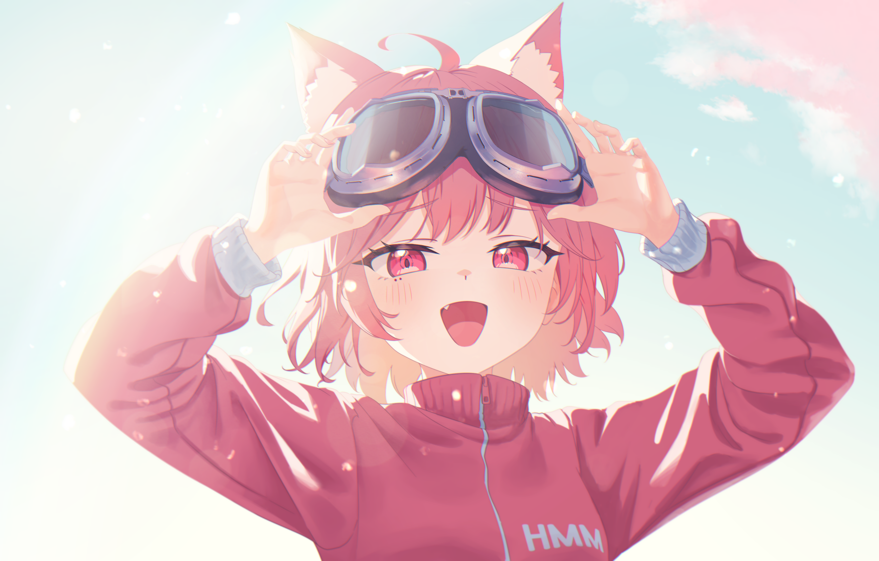 1girl absurdres ahoge animal_ear_fluff animal_ears arms_up blue_sky blush cat_ears commentary commission day fang goggles goggles_on_head highres jacket long_sleeves original outdoors pink_eyes pink_hair pink_jacket short_hair sky ski_goggles supersugar track_jacket virtual_youtuber zipper_pull_tab