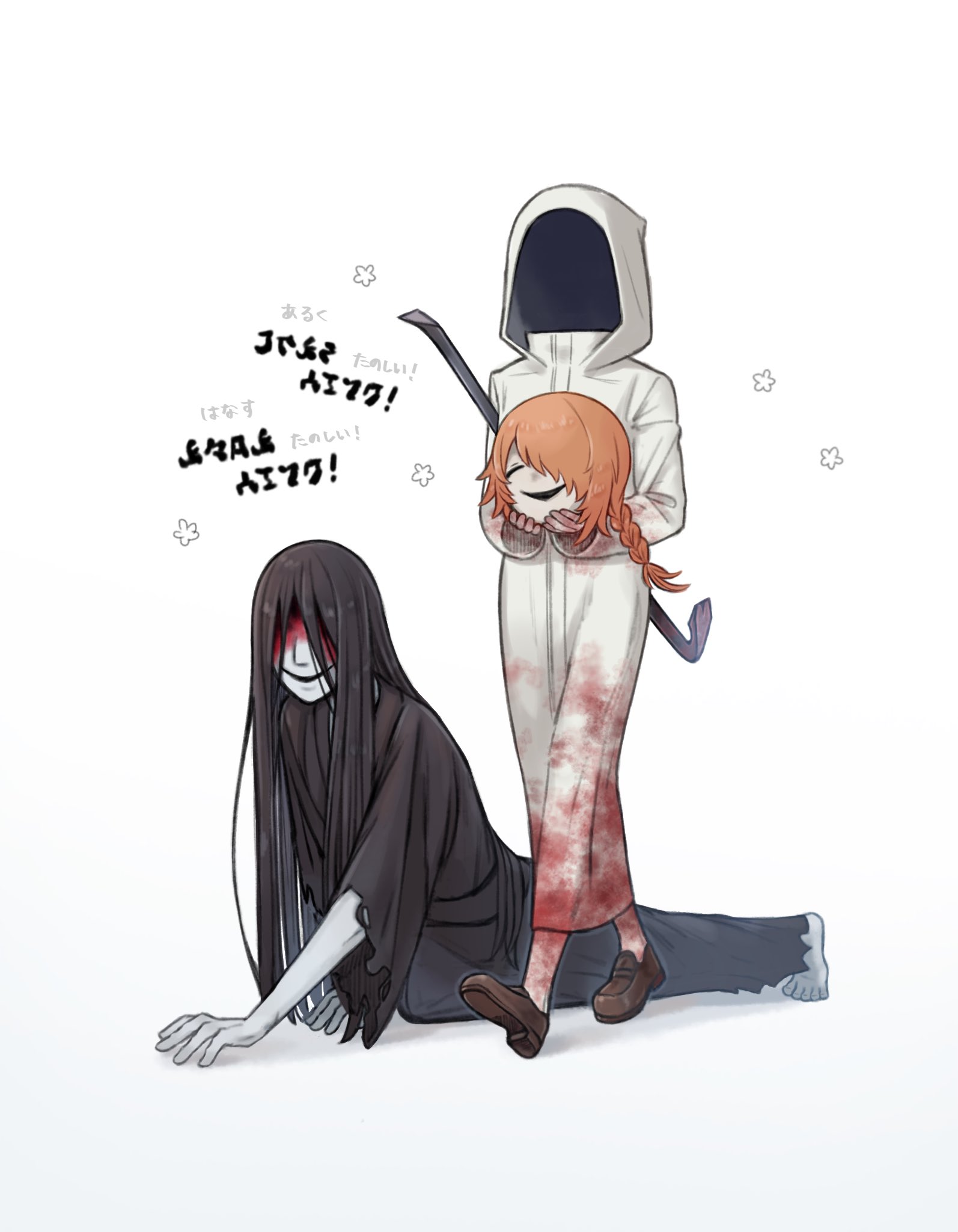 1girl 2boys black_hair black_kimono blood blood_on_clothes blood_on_face blood_on_hands braid commentary_request crawling crowbar full_body adashino_adami highres holding_detached_head homicipher homicipher_text hood hood_up japanese_clothes kimono long_hair mr._chopped mr._crawling multiple_boys onigashirayuta orange_hair raincoat severed_head simple_background translation_request very_long_hair walking white_background