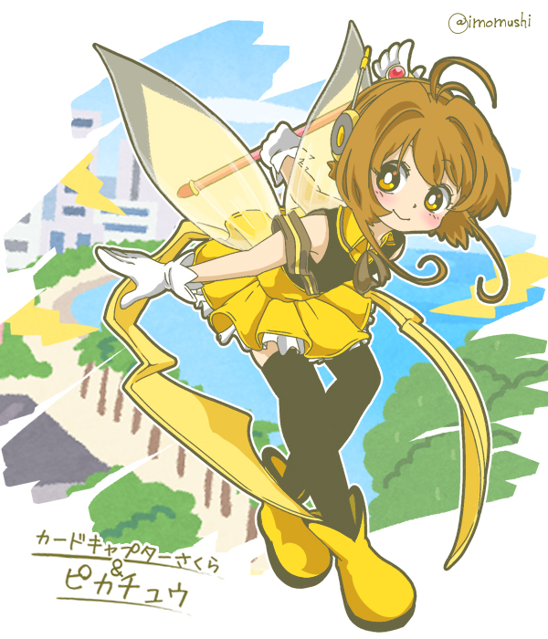 1girl black_shirt black_thighhighs blush bright_pupils brown_hair closed_mouth commentary_request cosplay fuuin_no_tsue gen_1_pokemon gloves imomushi_(pixiv_9001433) kinomoto_sakura looking_at_viewer magical_girl nintendo pikachu pikachu_(cosplay) pokemon shirt skirt solo thighhighs twitter_username white_gloves white_pupils wings yellow_skirt