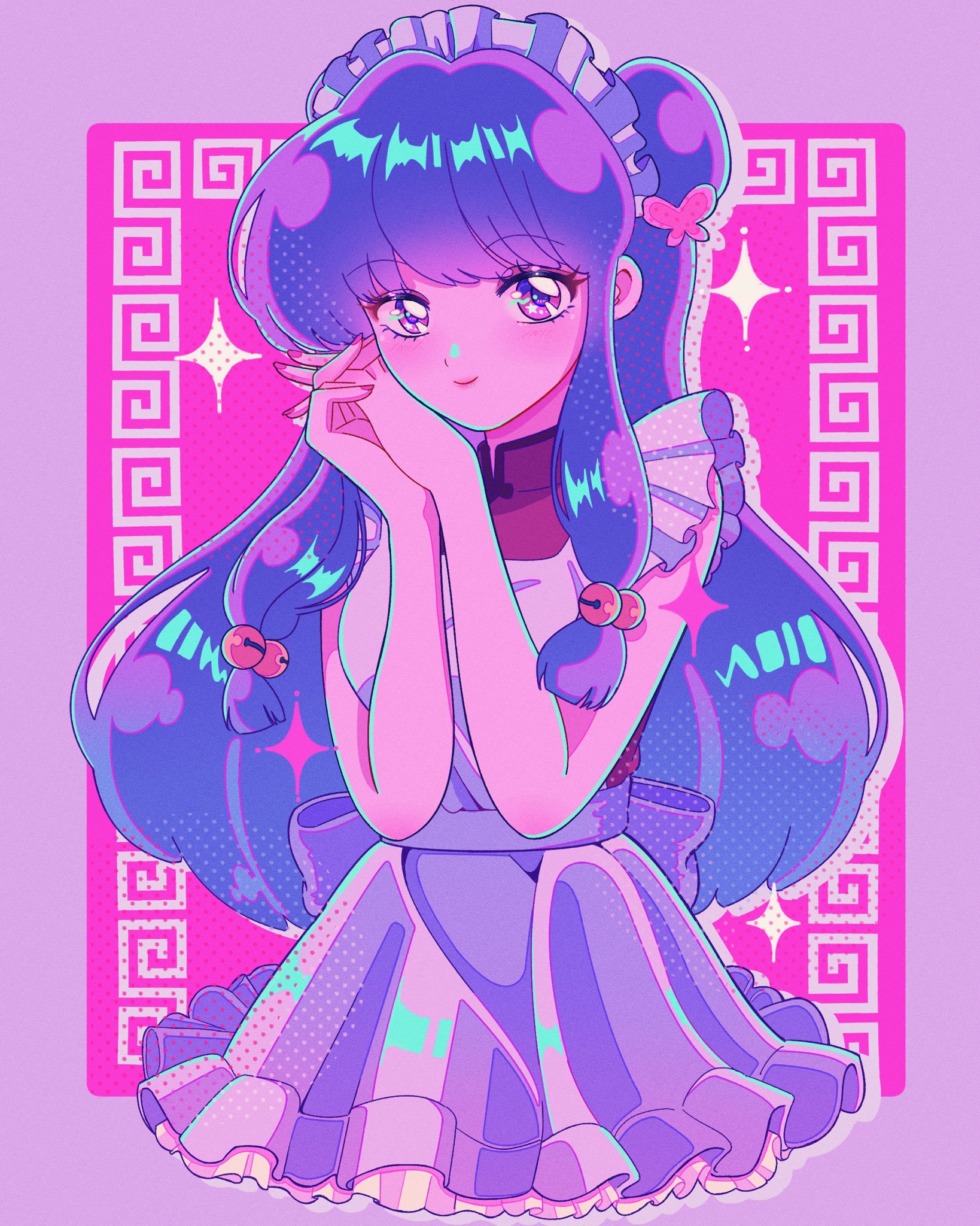 1girl apron bell chinese_clothes double_bun hair_bell hair_bun hair_ornament highres long_hair looking_at_viewer maid_apron maid_headdress meandros own_hands_together purple_eyes purple_hair ranma_1/2 red_shirt sail_ofhope shampoo_(ranma_1/2) shirt sidelocks sparkle white_apron