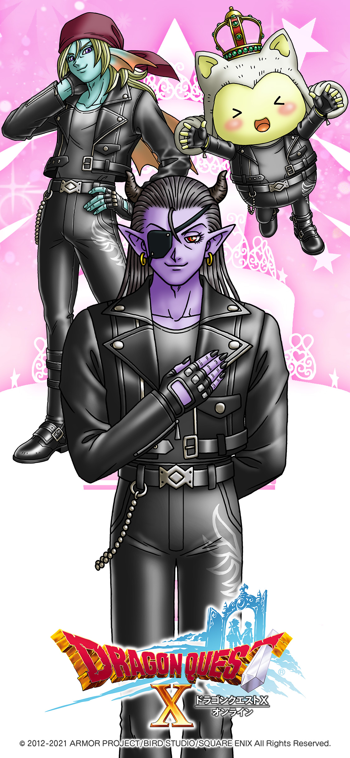 >_< 3boys absurdres animal_ears arm_behind_back artist_request bandana black_footwear black_gloves black_hair black_horns black_jacket black_nails black_pants blonde_hair blue_skin boots collarbone colored_skin copyright_logo crown demon_boy dragon_quest dragon_quest_x earrings eyepatch fingerless_gloves fingernails fins fish_boy gloves gold_earrings grey_shirt hair_slicked_back hand_on_own_chest hand_on_own_hip hand_on_own_neck head_fins highres hoop_earrings horns hyuuza_(dq10) jacket jewelry leather leather_jacket leather_pants logo long_hair looking_at_viewer male_focus medium_hair multiple_boys najinn_(dragon_quest) official_alternate_costume official_art official_wallpaper open_hands open_mouth pants pointy_ears prince_laguas purple_eyes purple_skin red_bandana red_eyes sharp_fingernails shirt smile third-party_source white_hair yellow_skin