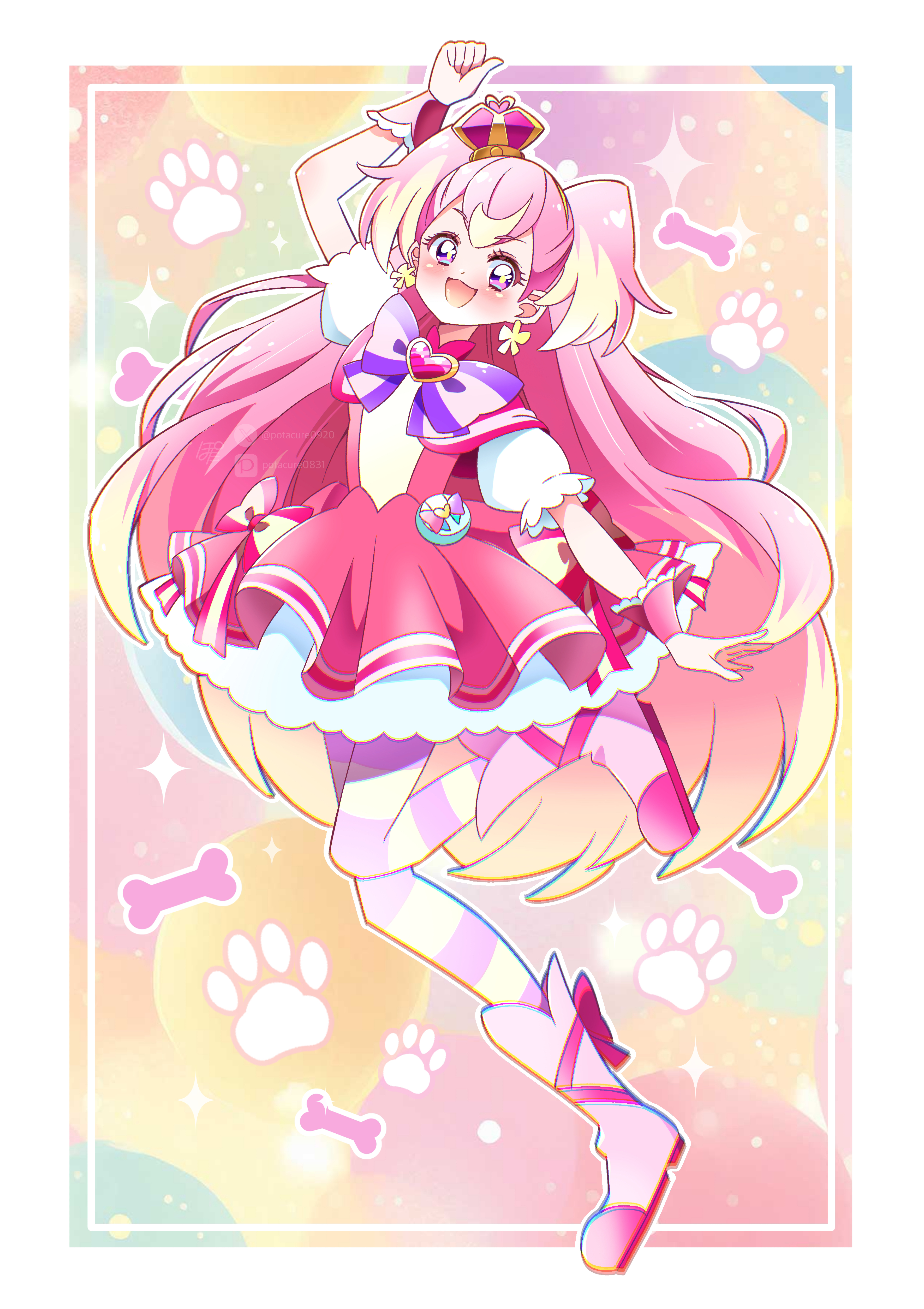 1girl absurdres blush boots bow bowtie brooch crown cure_wonderful dress earrings heart heart_brooch highres inukai_komugi jewelry long_hair magical_girl mini_crown multicolored_hair open_mouth pink_boots pink_dress pink_eyes pink_hair pixiv_username pota_(potacure1011) precure puffy_short_sleeves puffy_sleeves purple_bow purple_bowtie short_sleeves signature smile solo striped_clothes striped_thighhighs thighhighs twitter_username two-tone_hair two_side_up very_long_hair white_sleeves wonderful_precure! wrist_cuffs