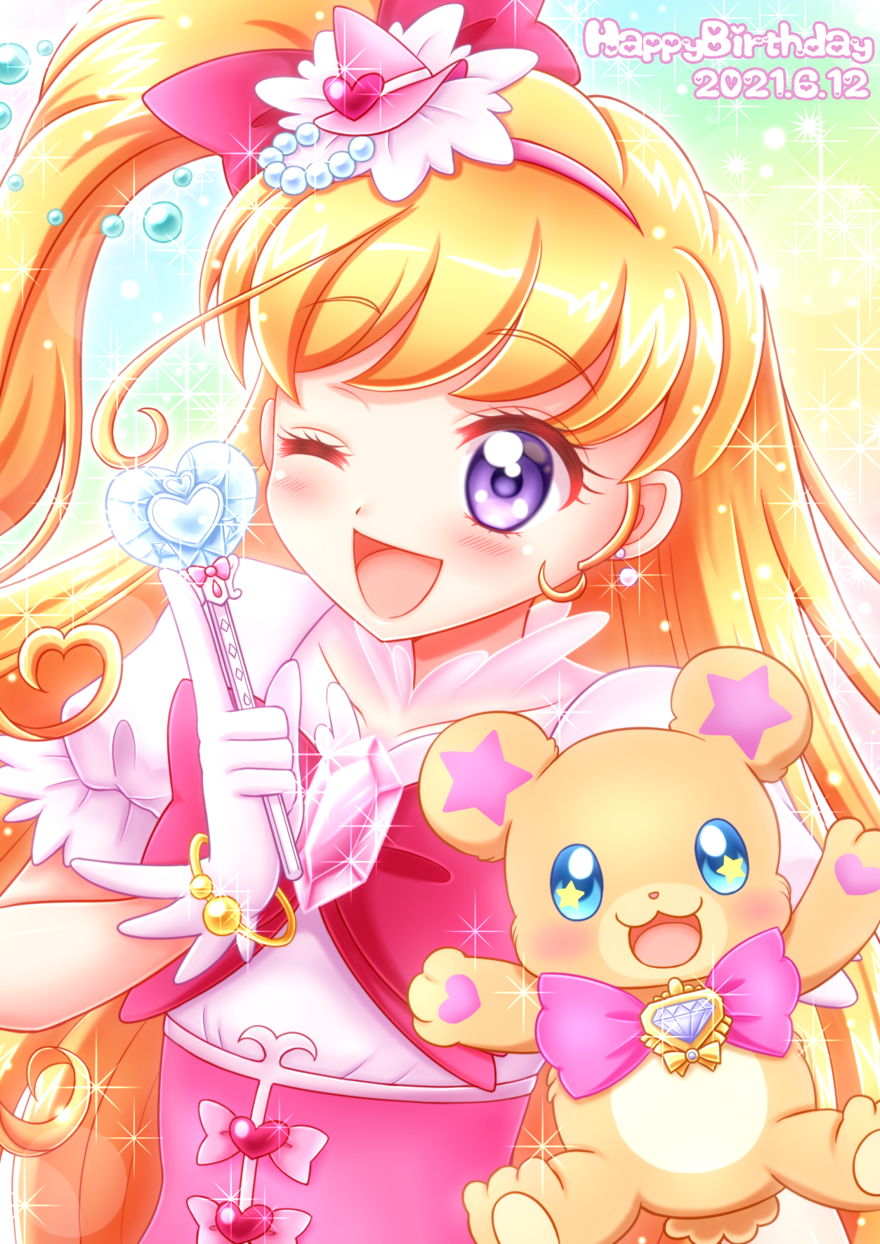 1girl asahina_mirai blonde_hair blush bow bowtie brooch cure_miracle dated dress earrings fairy gloves hair_bow hairband happy_birthday hat highres jewelry long_hair magical_girl mahou_girls_precure! mofurun_(precure) niwatori_(syamo_chamo) one_eye_closed one_side_up open_mouth pink_bow pink_bowtie pink_hairband pink_hat precure puffy_short_sleeves puffy_sleeves purple_eyes short_sleeves smile solo stuffed_animal stuffed_toy teddy_bear two-tone_dress white_gloves witch_hat